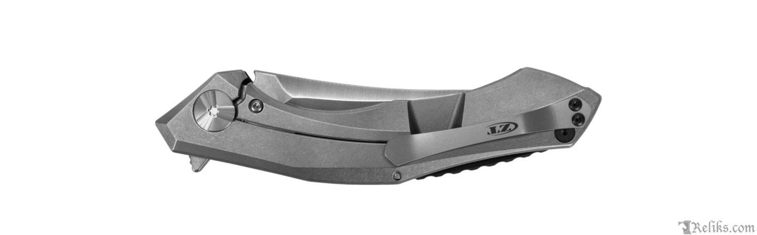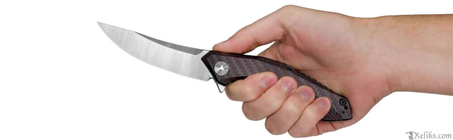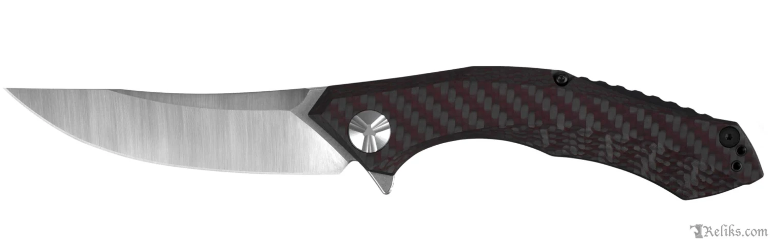 This super-sized version of the 0460, designed by Dmitry Sinkevich, features a 3.75-inch upswept blade of CPM 20CV steel for superior hardness, corrosion resistance, and edge retention. The 0462 also has a colored-carbon-fiber front scale with a deep-red weave of color. This new composite material is lightweight, strong, functional, and looks great. And note that theres no logo on the bladenothing to interrupt the curve of the design. Instead, ZT added details to the interior of the handle that are waiting to be discovered. Steel pivot nut with bead-blasted finish, titanium pocketclip with bead-blasted finish, black anodized aluminum backspacer and steel screws with black-oxide finish.