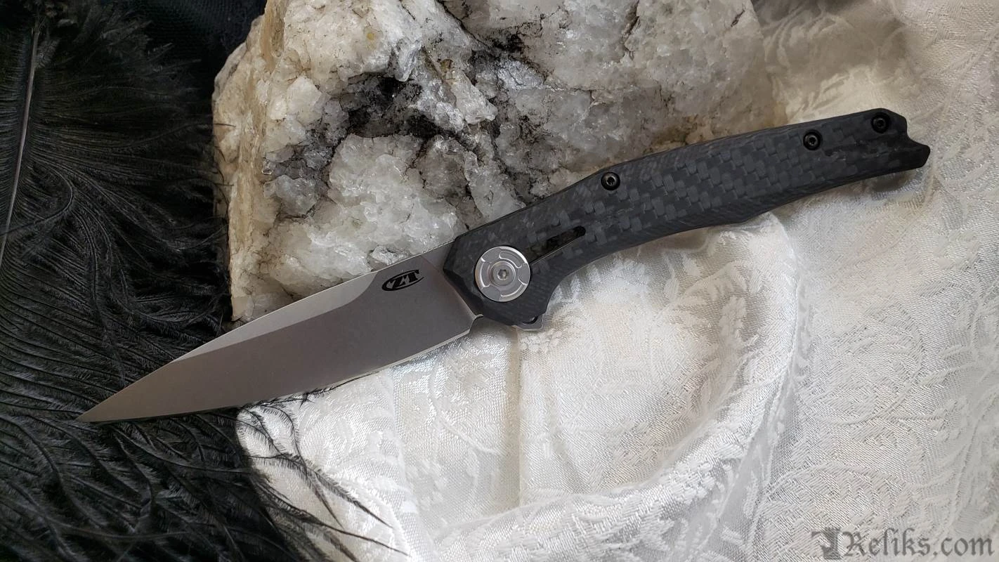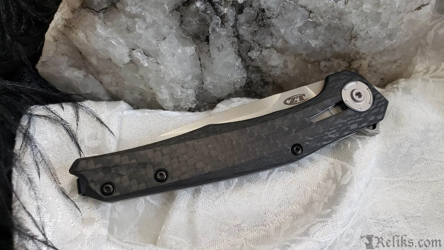Finding the perfect balance between big and small, the 0707 offers something for everyone with its premium looks and cutting performance. Its sleek profile is comfortable in the hand, while also keeping a low profile in the pocket. Yet its 3.5-inch blade offers a substantial edge for most cutting tasks. Drop point blade features a full width flat grind for precision slicing ability. Plus, for a first in the Zero Tolerance lineup, users can access the blade with ZT’s Tuned Detent System (TDS). Tuned Detent System (TDS) enables us to fine-tune the detent so itÂ’s not too heavy, not too light and provides consistent opening even when pressure is applied to the lockbar. A reversible extra-deep-carry pocket clip, carbon fiber handle scales, and CPM 20CV blade steel round out this feature-packed ZT innovation. CPM 20CV blade steel offers exceptional hardness, wear resistance, edge retention and the stonewashed finish helps hide use scratches. Made in the USA.
