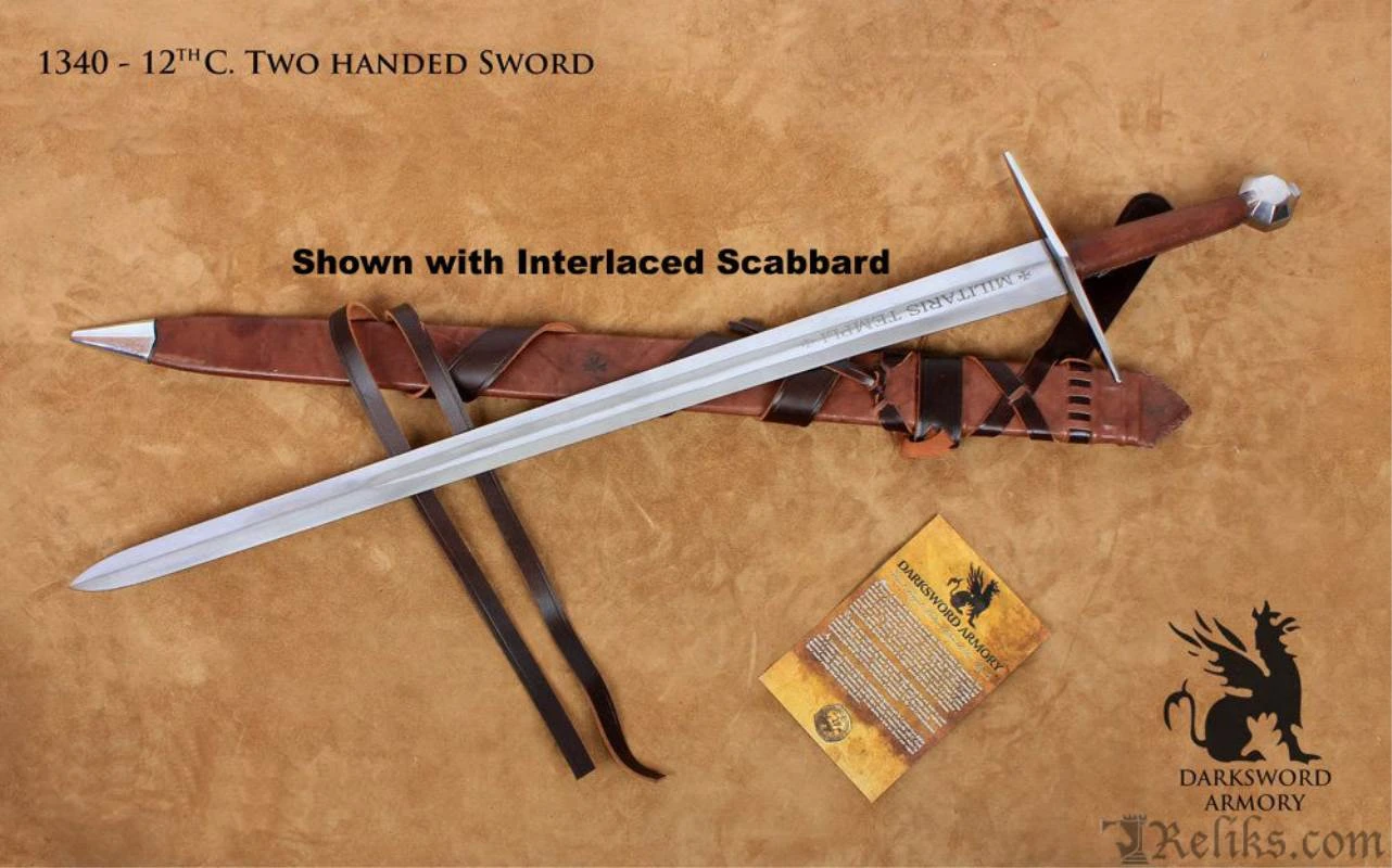 Classified as type Xa or XI, this is one of the most significant two handed swords of the medieval period. Numerous variations are found throughout the European continent, establishing a general conformity and indicating a clear pattern of influence among smiths of the time. Variations are found in the Royal Armoury of Turin, in the Louvre of Paris, in the Imperial Treasury of Vienna, in the Royal Armoury of Madrid and in the Hermitage, Petrograd. Available with Standard or Interlaced Sword Belt Scabbard.