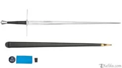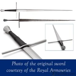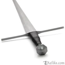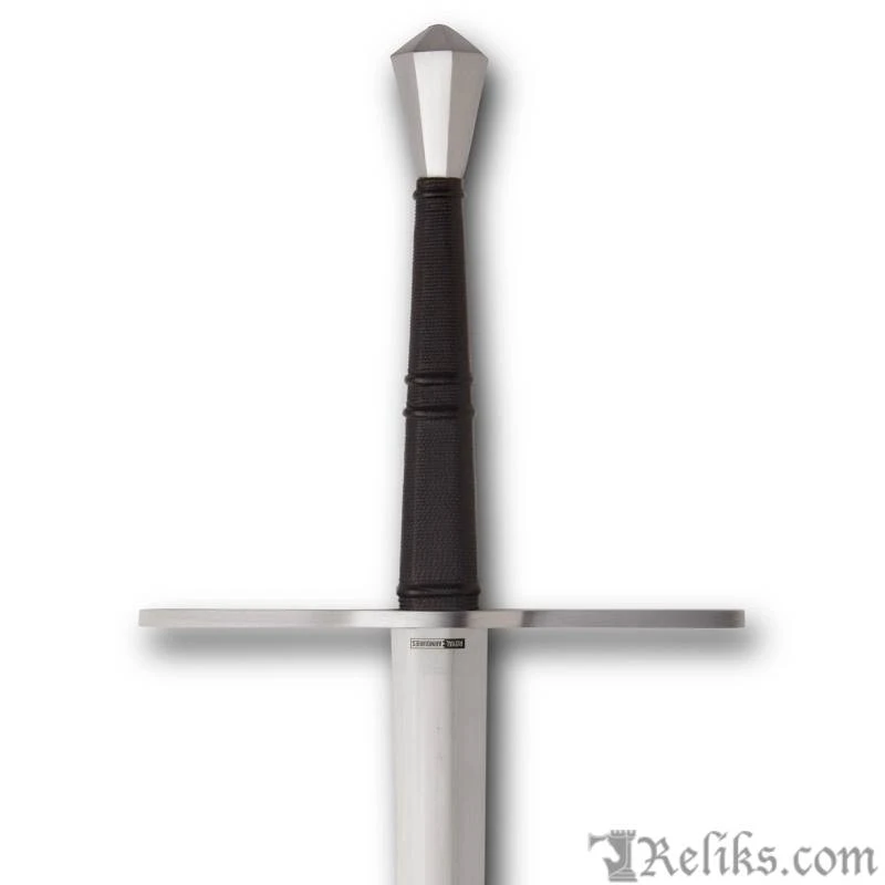 This is a reproduction of an early 15th-century longsword, believed to have been found in the River Thames before finding its way into the Tower of London collection. Part of the Royal Armouries Collection by Windlass, the original dates to around 1400-1430. This is a hand-and-a-half sword. The stiff and acutely-tapered blade ends in a robust but slender point. This type of sword was used in one or two hands, depending on circumstance, and in armored combat, the blade could also be gripped in half swording, to better drive the point into the gaps of an armored opponent, and also to use the crossguard and pommel for wrestling and striking. This is the type of sword that English knights would have carried at the Battle of Agincourt. The blade of this sword has three transitions, from a hollow ground blunt ricasso next to the guard to a hexagonal cross-section, and finally to the flattened diamond section point. A relatively nimble sword, but with more blade presence than you might expect.