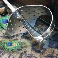 The sheath is made with a wood body and covered with leather. The tip is reinforced with a brass chape that features a traditional cut-out. At the throat, the leather extends upward and covers part of the guard at the ricasso. Includes a certificate of authenticity on heavy stock, a tin of Windlass Classic Wax, and a polishing cloth. Made by Windlass Steelcrafts, the original can be seen in the Royal Armouries Collection, Object Number IX.16.