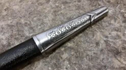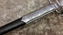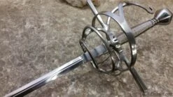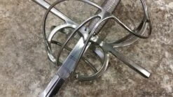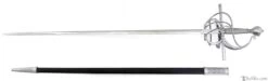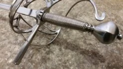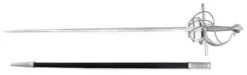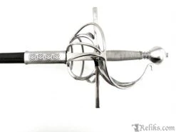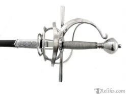 A beautifully executed 17th Century Italian rapier with a very complex hilt and faceted pommel. The grip is hand wound with silver plated wire with woven wire rings top and bottom. The hand forged, high carbon steel, fully tempered blade features a wide fuller to lighten and strengthen it for thrusting and the heavy ricasso provides extra strength to the main stress area. Top quality, genuine leather scabbard with deeply engraved floral pattern on the throat and tip. This type of sword was deadly effective as a dueling weapon.