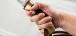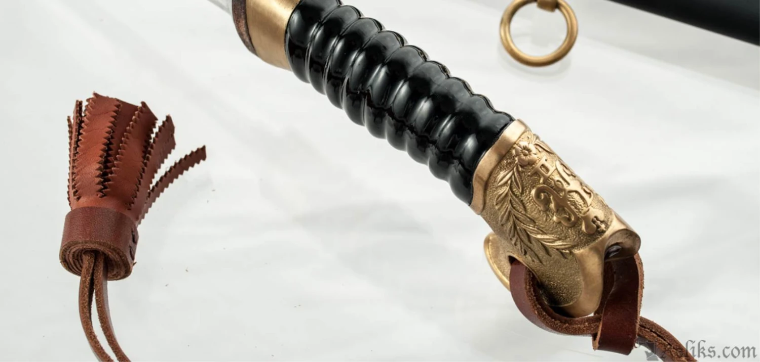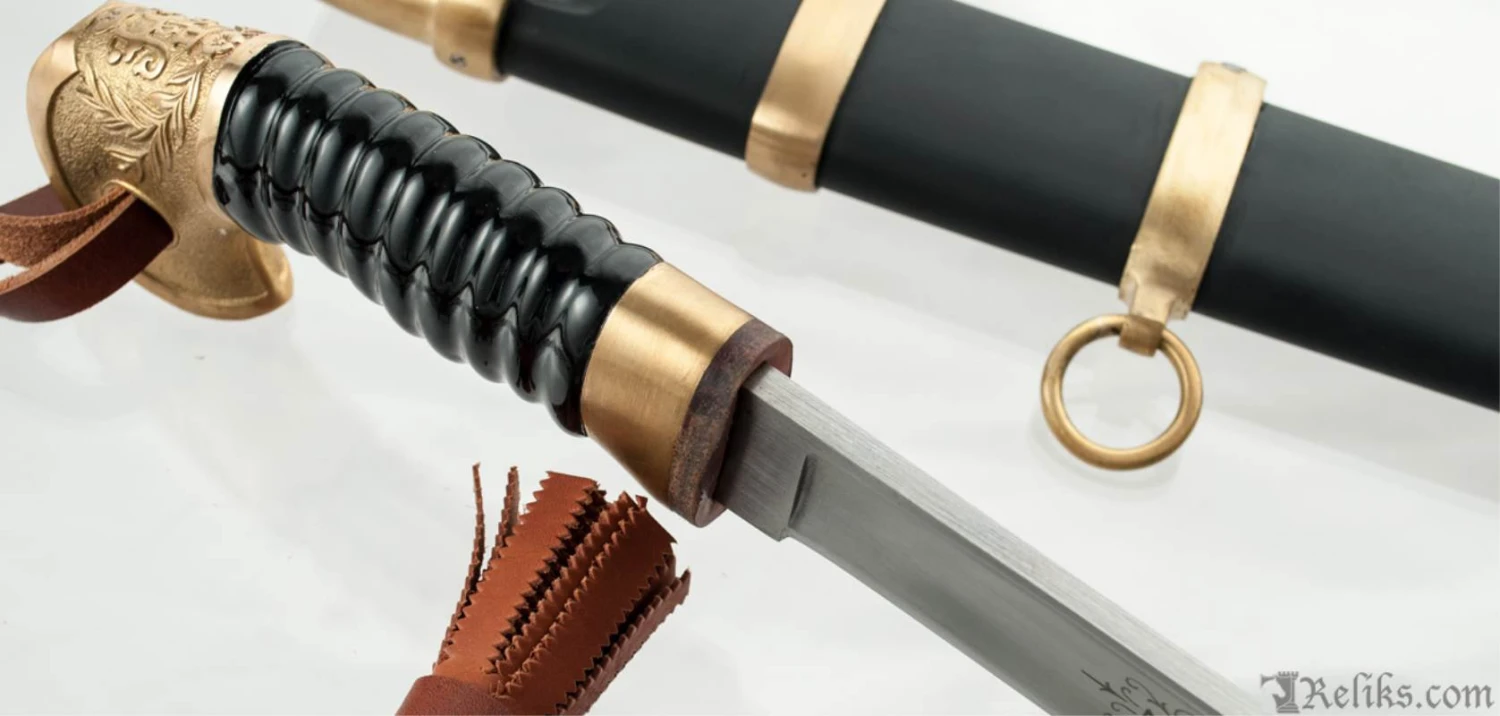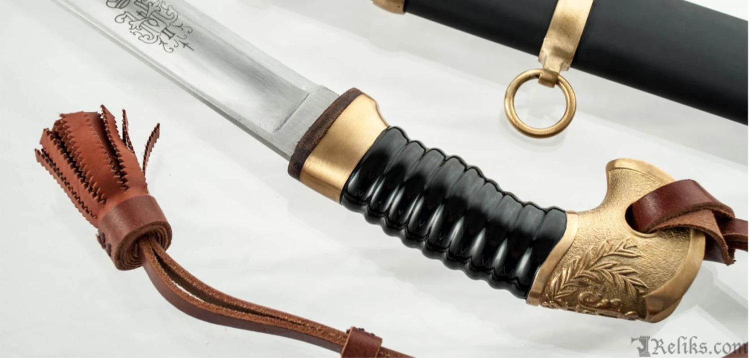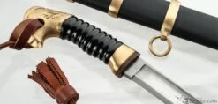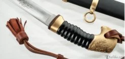 The unique Shashka (or Shashqua) cavalry saber has its roots in the 12th century Caucasus region of Europe. Long associated with the Cossacks, the “Cavalry of the Steppes”, the sword was standard military issue for Russian cavalry of the day. This version replicates the Model 1881 Shashka, originally produced during the reign of Tsar Nicholas II, whose cipher appears on the pommel. The sharp high-carbon blade, again etched with the royal cipher, features the distinctive blade geometry of the saber and the strong distal taper provides a balance ideal for its slashing role. The unique hilt styling dispenses with the basket guard typical of other sabers and instead relies on a ribbed hardwood grip and a strongly hooked pommel, assisted by a strong leather lanyard, to provide handling security.