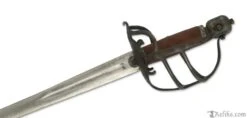 Replicated from an original in the collection of the Royal Armouries in England, our Mortuary Hilt Sword is a classic example of a cavalry or dragoon officer’s sword of the 17th century English Civil War period. Deriving its name from the style of sword which memorialized King Charles I, who was executed in 1649, The Mortuary Hilt Sword’s steel basket is decorated with scrolled foliage while an engraved head of Charles I appears on the pommel. The lozenge-section double-edged blade is partially fullered and bears the swordmaker’s mark “1414”, the derivation of which has been lost in time. The leather handle wrap terminates in silver wire “Turks Head” knots. The sword, like the original, is beautifully balanced. This version of the sword features an antiqued finish. The hilt is crafted in stainless steel, to minimize maintenance, and is finished with a museum-quality patina. The high-carbon blade is also lightly “antiqued” to promote authenticity. The grip of the mortuary-hilt is leather-covered, as is the scabbard.
