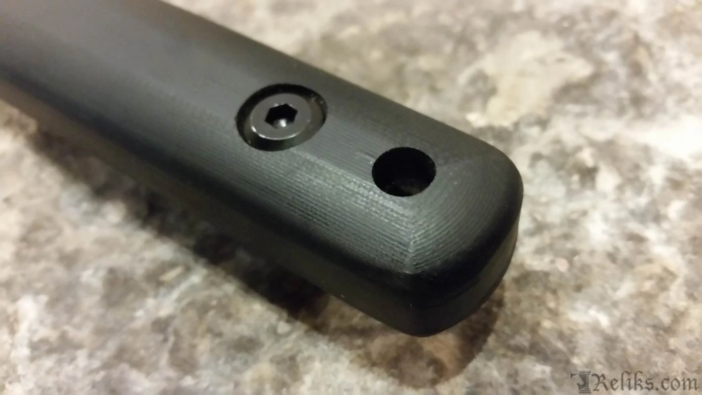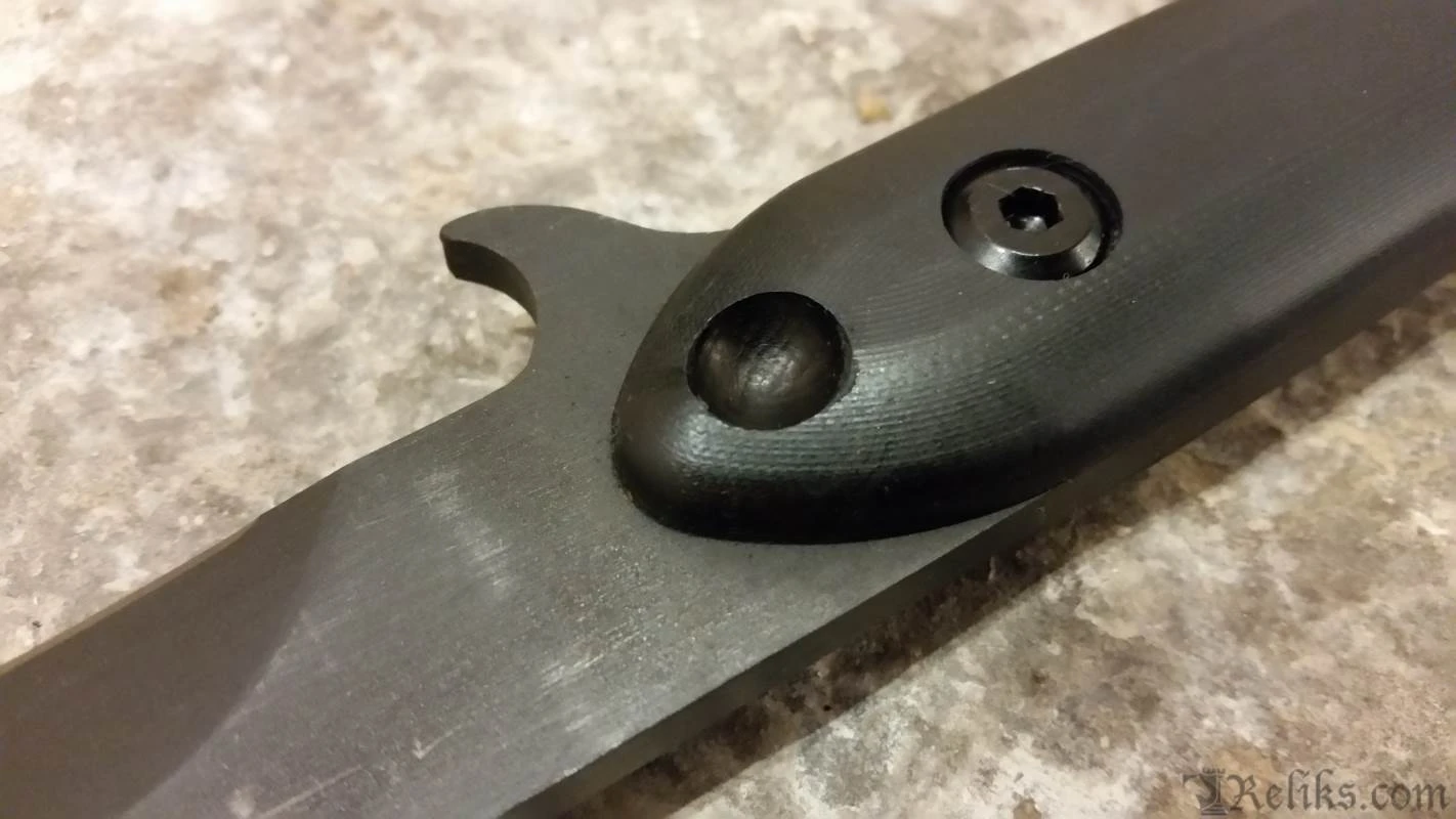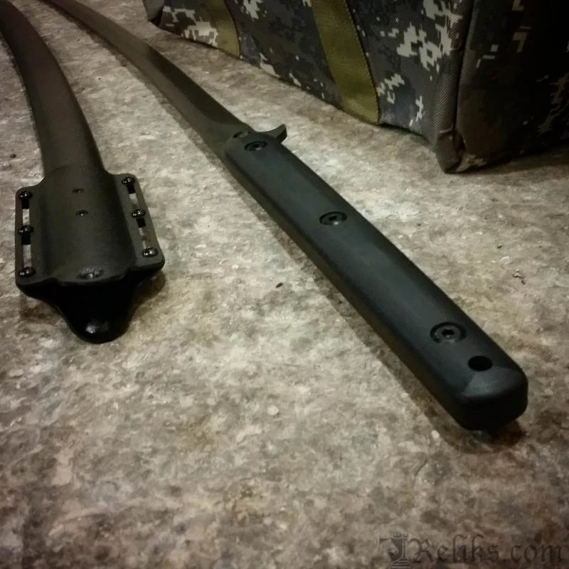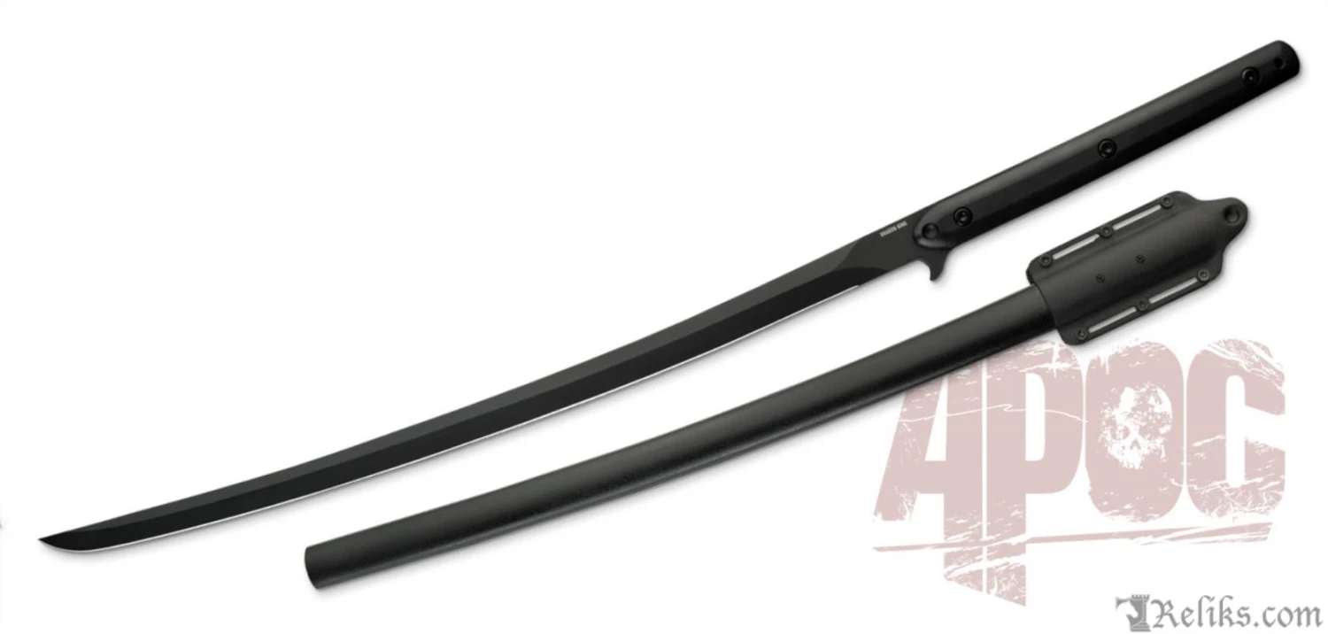 The A.P.O.C. Katana at a glance looks atypical except for the classic Japanese styled blade. But fans of Gus Trim will recognize his subtle style and perfection in a design thats historically atypical for this famed sword maker. When he was still making this sword, Gus called this model the “Little Tigress” and it’s easy to see why. The 11 3/8” full tang G10 handle glides gently in the hand as the handle slabs, rivets and blade profile are effortlessly flush all around preventing blisters or lesions which eliminates a big problem when combatting in an infectious environment. The hooked guard prevents your fingers from sliding onto the blade edge. The 23 1/2″ blade edge and contour features another Atrim profiling feature allowing precise cuts and slices. At 36 5/8” overall and 2 lbs 6 oz the A.P.O.C. Katana is hefty enough to split skulls and sever limbs but light enough to not hinder a valiant retreat.