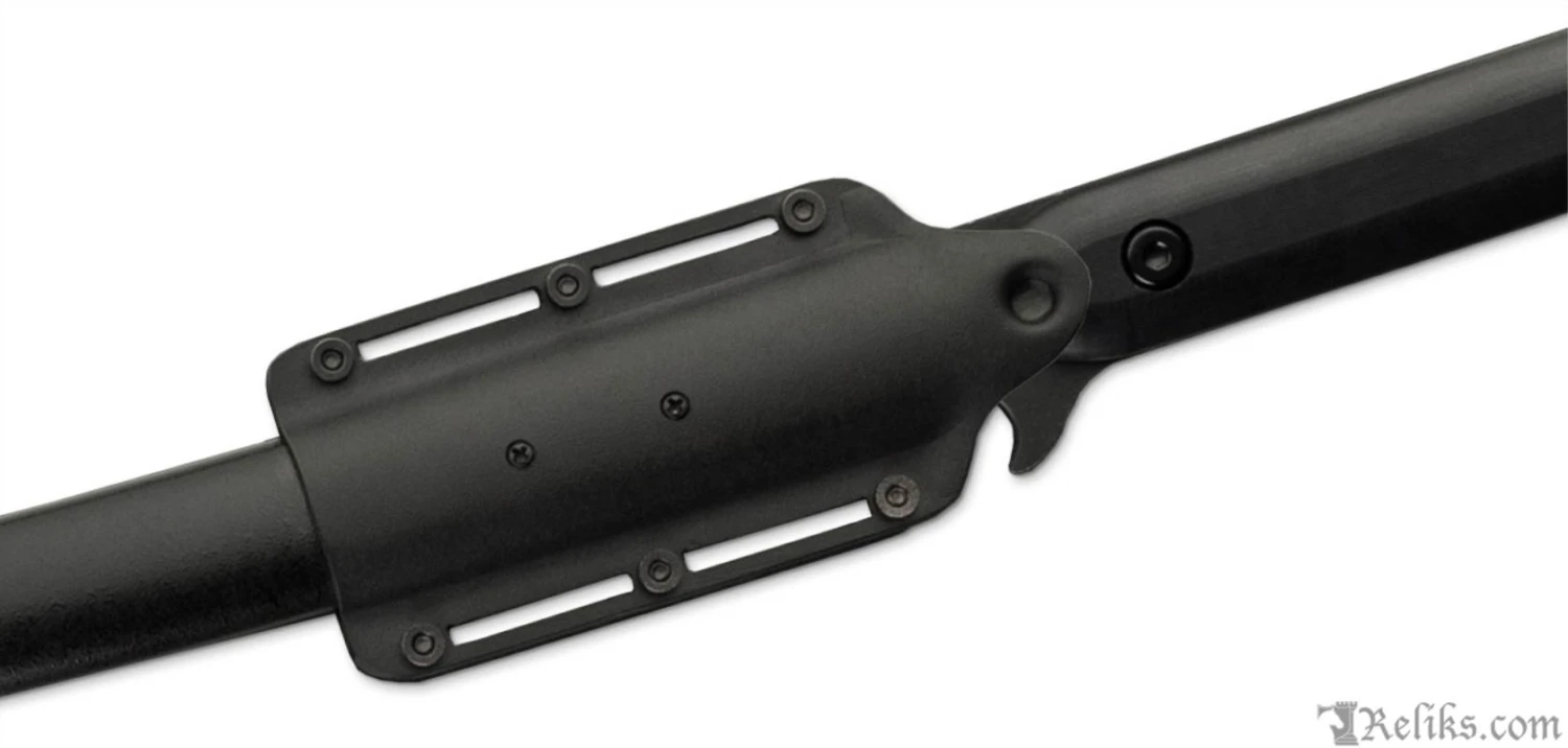 The black textured fiberglass sheaths are fitted to a Molle compatible kydex platform that allows you to secure your swords to belt or pack in multiple carry positions. For belt or sling carry setups the platform has four slots 1 3/8″ long and 1/8″ wide. A hole in the end of the scabbard allows drainage in wet environs. A notch in the handle and the platform allows for stealth unsheathing as well as locking the sword securely for inverted maneuvers. No preparations for the end times are complete without an A.P.O.C. tactical sword for when the bullets run out, the knives are too short and your life is on the line.