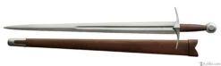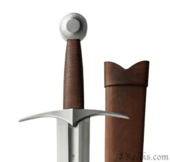 The second sword in a series of performance oriented swords designed by Gus Trim and produced by Kingston Arms, this early 13th Century style arming sword has a very slight forward balance… making it quick in the hand and devastating in the cut. Based on Oakeshott’s Type XIV specification these swords were used in the 13th to early 14th Century in that transitional period from mail armor to the full on plate worn in the 15th Century. This sword is therefore more cut oriented than later period swords with a more acute point than earlier examples. This melding of cut and thrust ability coincides perfectly with use of the sword and shield or buckler of the time.