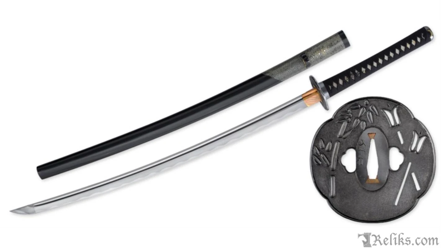This rendition of the classical bamboo themed katana is a light and fast sword. Hand forged from imported European DNH7 high carbon steel the differentially hardened blade features a “bo-hi” or fuller to lighten and balance the blade without sacrificing strength. This is an extremely collectible and capable sword.