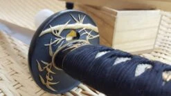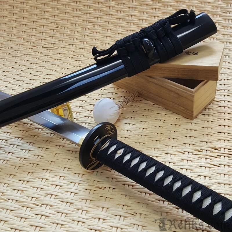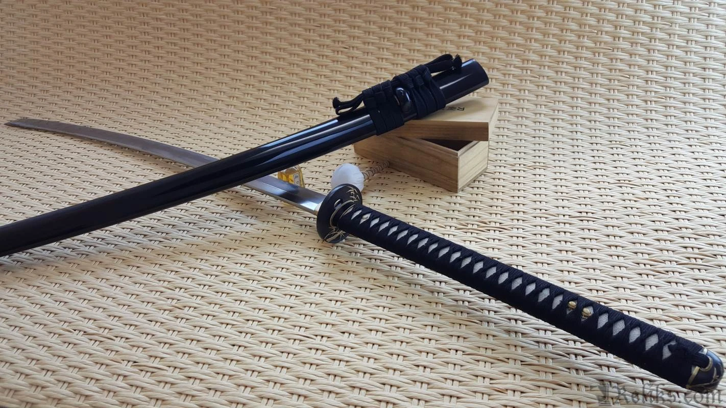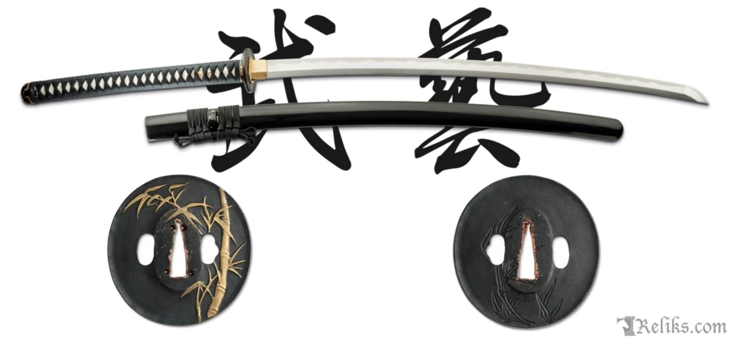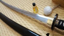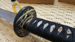 At Bugei we reach into history to design blades to be used by the student of traditional Japanese Sword Arts. The Bamboo Katana was Bugei’s first production sword. All these years later the updated Bamboo Katana with its elegant black fittings and gold bamboo highlights continues to be one of our most popular swords.Bamboo is a popular theme for Japanese sword mounts as it represents both strength and flexibility, qualities highly prized by the Samurai. The tsuba (sword guard) is made from a plate of soft copper that is given a hard gloss black coating and then gold highlights are applied to the intricate bamboo. The tsuka (handle) is wrapped in black silk ito to complement the gloss black saya and glossy black fittings. Originally made of Manchurian Rail steel, the Bamboo Katana is now made with a superior folded Swedish Powdered steel for added beauty and toughness. The Bamboo is a larger sword with moderate niku (“meat to the blade”) creating an excellent sword for more difficult traditional targets. As always, our swords not only look like high quality swords, they also have quality of design, fit and finish that is not readily visible, like our 10″ nakago with two mekugi to insure that the blade stays secure in the tsuka. The steel of these blades is folded and forged, then clay coated and heated to a red hot state before being quenched in water. This forms a resilient softer steel body (45-48 RC) with an aggressively hard edge (59 RC). This provides exceptional strength and shock resistance with superior edge holding and cutting ability. Careful polishing reveals the hamon and hada showing off the different crystalline structures of the steel. Our swords clearly show the martinsite edge, the pearlite body, and nioi crystalline structure that lights up on the true hamon. Both the tsuka and the saya are hand made for each individual sword. This attention to detail means that you, our customer, get the best that we can provide. (cleaning kit not included)