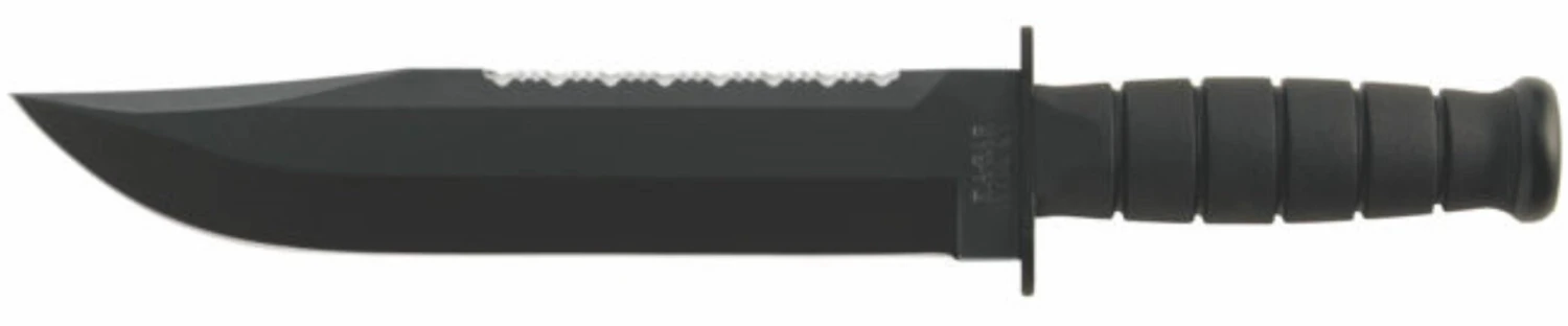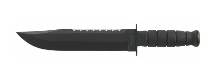Designed in cooperation with the highly-trained folks at S.E.I.G.E. (Strategic Edge Impact Global Enterprise) of Rochester, NY, the high-carbon, non-reflective black blade of the Ka-Bar Big Brother is epoxy powder-coated and tests prove the finish is more durable than ever. The classic oval shape of the original KA-BAR remains and has been modernized with a material nearly impervious to sweat, chemicals, water and wear – Kraton G®. Featuring a serrated top and straight bottom, the “Big Brother” is a perfect addition to the Kraton G® line.