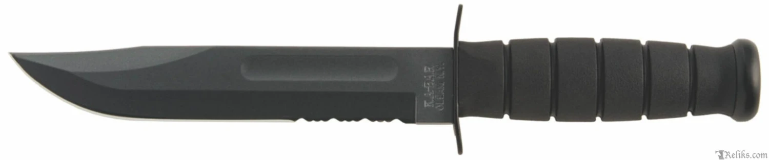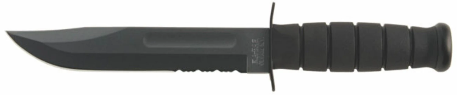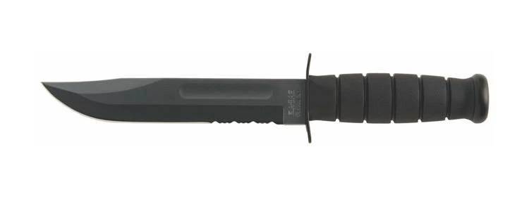 A partially serrated edge on the black Ka-Bar makes cutting looped and synthetic materials a breeze. Blade length 7″, Overall length 11 3/4″. 1095 Carbon Steel blade with a Rockwell Hardness of 56-58. Handle is constructed of Kraton G and comes with a black leather sheath.