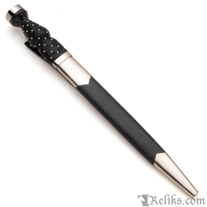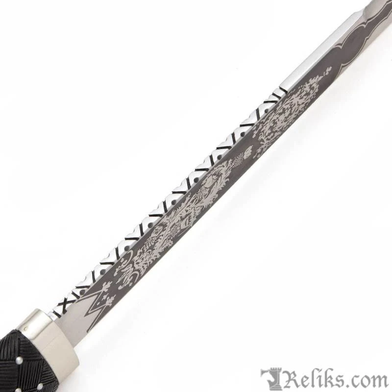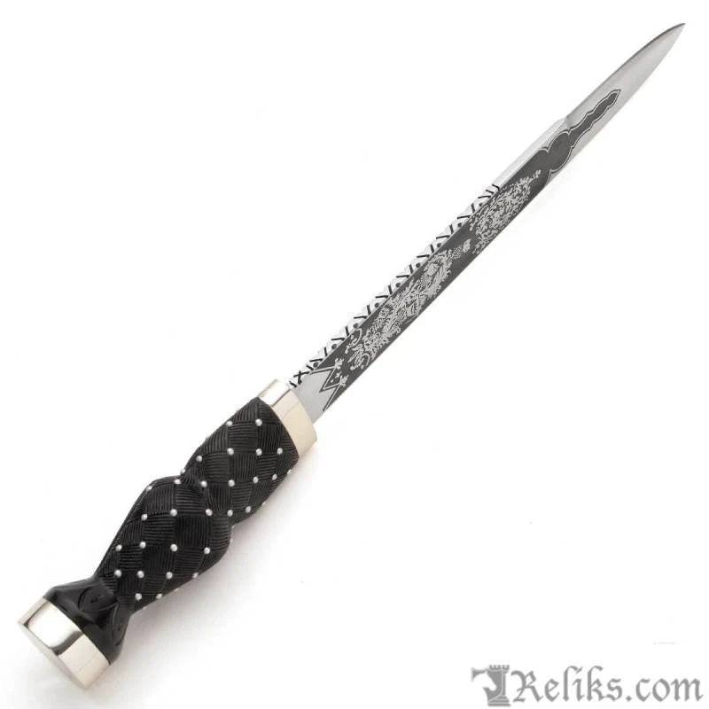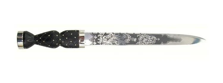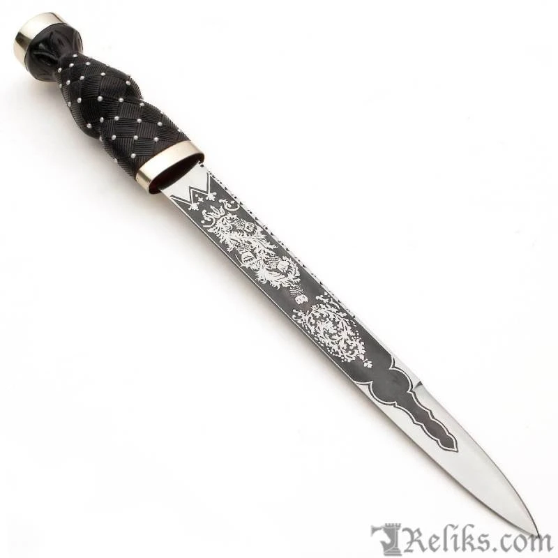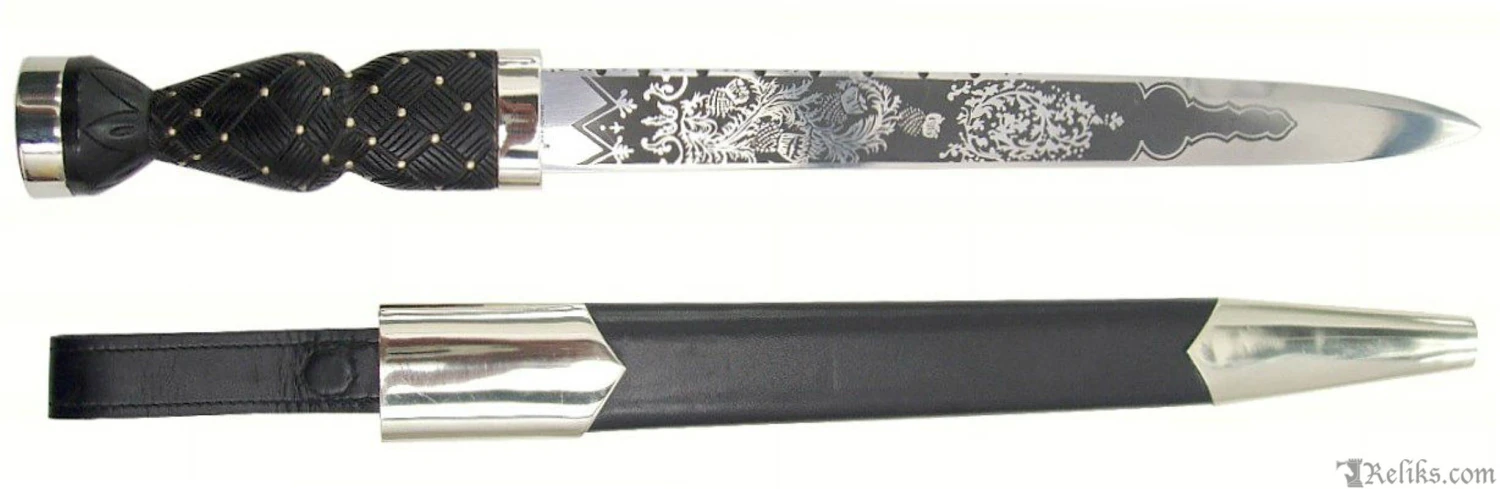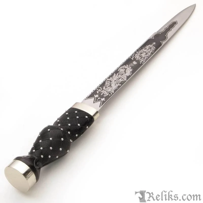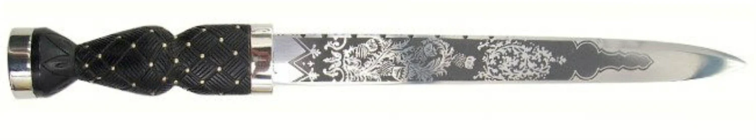 This dirk blade showcases crisp etchings of the traditional Scottish foliage and thistle motif on both sides of the blade. A 5 inch long, swaged false edge and a knurled pattern on the blade back mark this dirk with distinction. The black wooden handle is carved in an interweave pattern dotted with ornamental nickel silver tacks. The sheath is wood covered with leather and reinforced with metal throat and tip. This functional dagger is made in India by the government contractor for military knives, Windlass Steelcrafts. Comes factory sharp.