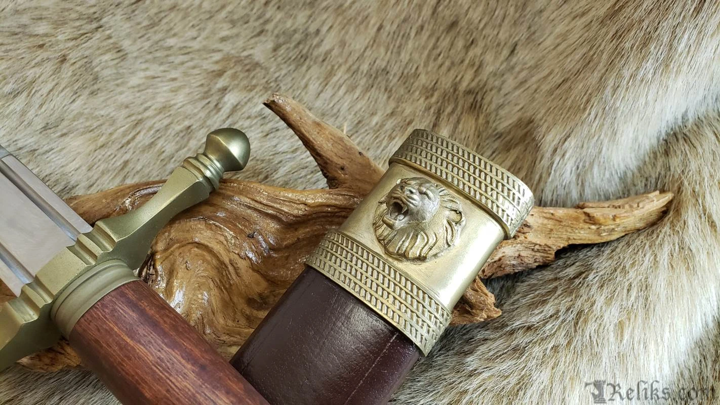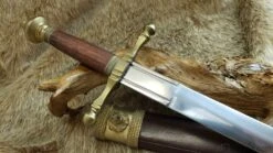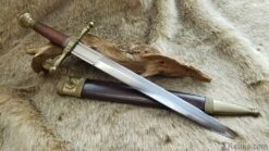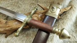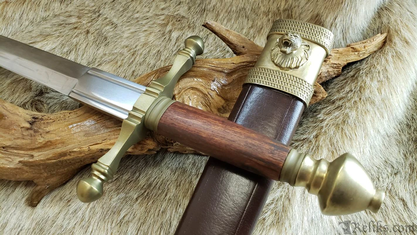 Named for the final battle of the Percy Rebellion of 1402-1408, this style dagger is typical of well-to-do martial wear of the period. The end result of a power feud between the 1st Earl of Northumberland Henry Percy and King Henry IV, the Battle of Bramham Moor was fought in snow on a cold 19th of February. The violent melee ended Percy’s life and the power of the Percy family, although a branch of descendants would rise to prominence later during the Wars of the Roses. This long dagger has an unpolished stained wood grip and low-sheen brass fittings. The brown leather scabbard features a throat and chape of brass that complement the dagger fittings. The belt hook is a finely detailed roaring lion’s head, befitting a nobleman. Made by Windlass Steelcrafts and comes factory sharp.