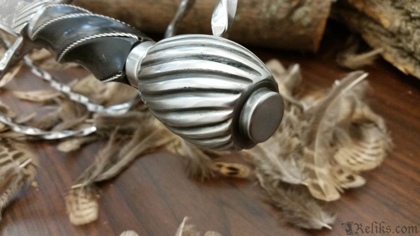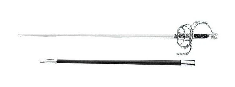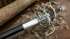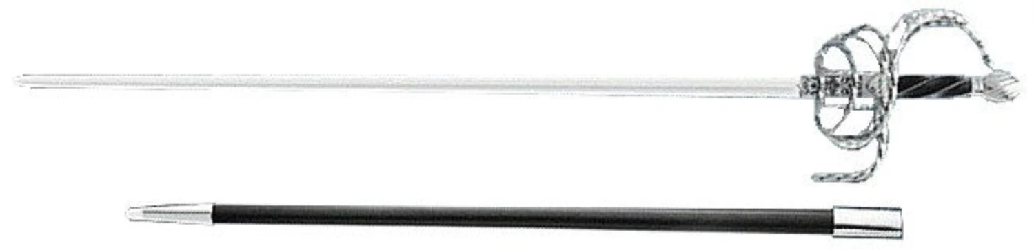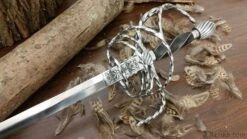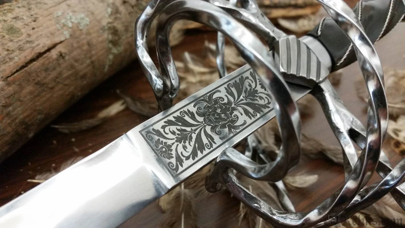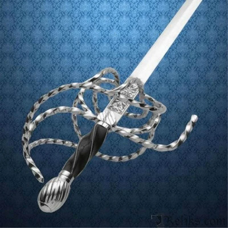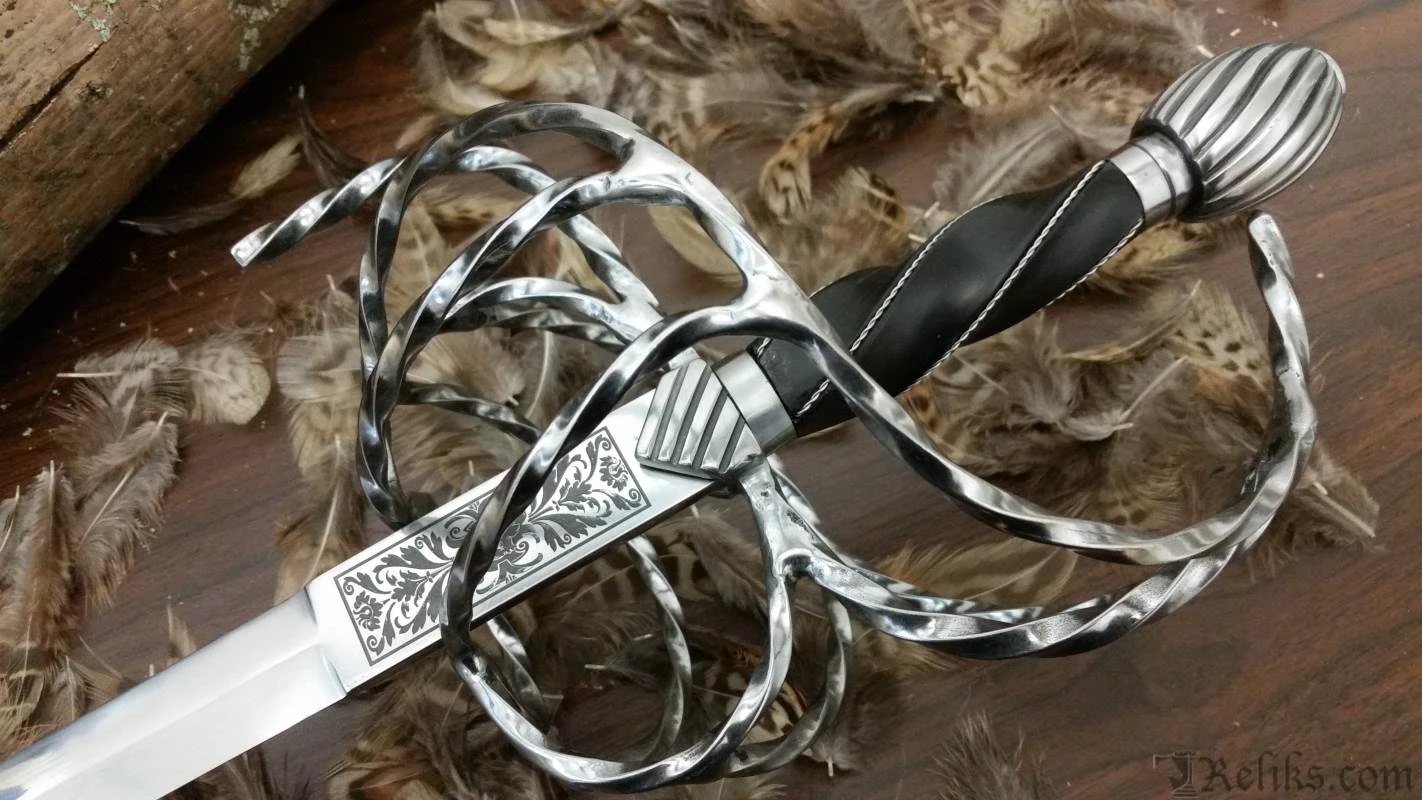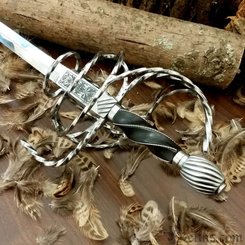 This stunning 17th century rapier has an expertly crafted swept & twisted metal basket. The heavily carved horn grip mimics the elegantly twisted metal of the hilt and is hand wound and inset with a single steel accent wire that provides an excellent grip while dueling. Better yet was the aristocratic, dashing look it gave the wearer while rakishly hanging from the belt. Hand forged, high carbon steel blade with flattened oval cross section. Extended, custom engraved ricasso for strength. Includes leather scabbard with twisted metal accents completing this magnificent and fast rapier. Made by Windlass Steelcrafts®.