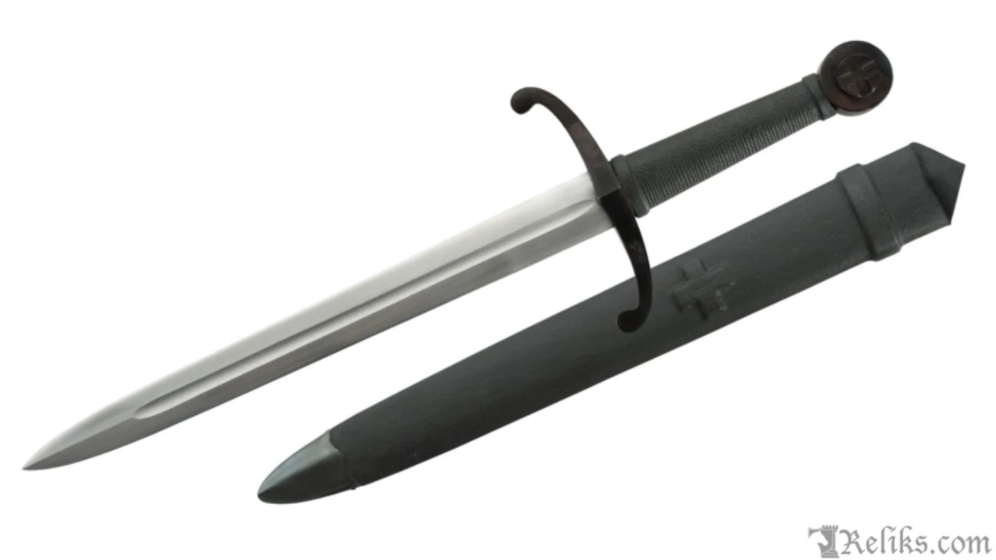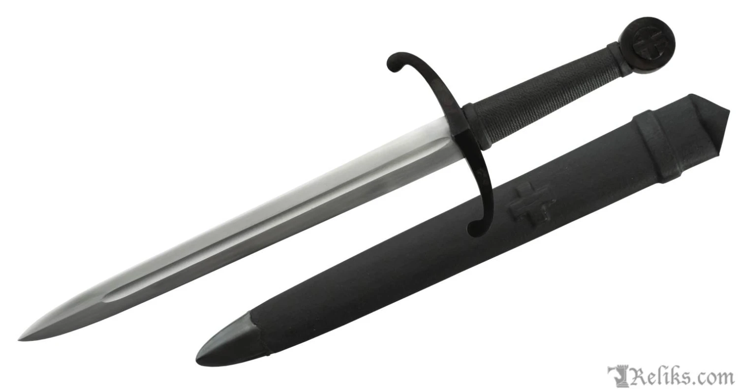 This dagger complements our Hospitaller Sword nicely while the 12 3/4″ hand forged high carbon steel blade makes for a deadly close-quarters weapon in its own right. The embossed grip is constructed of a solid wood core then wrapped in leather. The classic designs of the down-turned quillons of the guard and disc pommel are blackened in the same manner as the originals. Both sword and dagger are concealed in black leather wrapped wood core sheaths for secure carry.