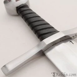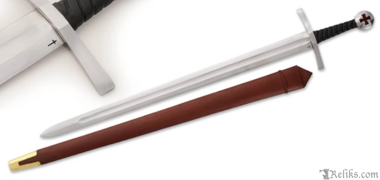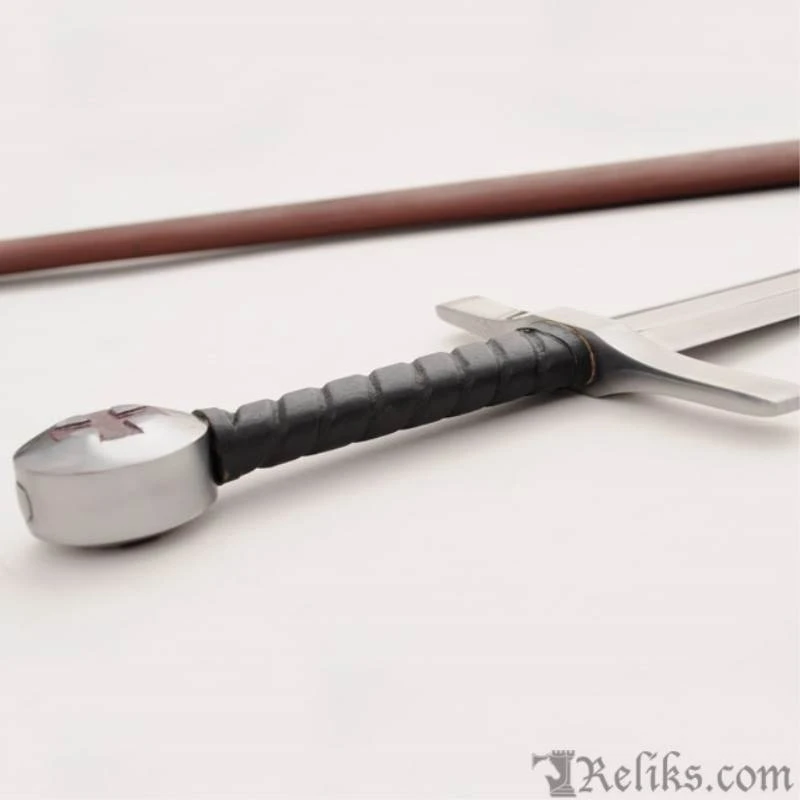 The blade of this sword is hand forged from 5160 carbon steel and hand tempered. The blade is then securely peened onto the pommel. The contoured handle is wood, wrapped in black leather. This sword also includes a wood scabbard wrapped in brown leather with brass accents at the tip.