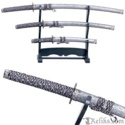 This is a 3 piece samurai set to enhance your decor. The katana or the long sword is 40″ overall with a 27 1/2″ stainless steel blade. The mid-length sword, the wakazashi measures an overall 30 1/4″ with a 19 1/4″ blade and the short sword or knife called the tanto measures 21 1/4″ with a 11 3/4″ blade. Each piece has a wood saya (sacabbard) with silver metal accents. The tsubas are adorned with two dragons and the handles are finished in a traditional wrap. Free 3 tier stand included (may vary from the one pictured.) These swords have a slight edge but are not sharpened for use. This is a decorative samurai set for display purposes only.