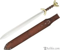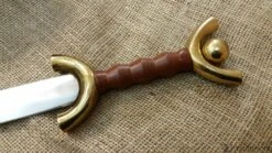Hanwei’s Celtic Sword has an anthropomorphic hilt and leaf-shaped blade. Solid brass hardware, a macassar ebony grip and leather scabbard make this piece ideal for the Celtic persona. Paul Chen swords are crafted in much the same way as swords were made centuries ago, except that the blades are now forged from a modern high-carbon spring steel, unlike the softer bronze used by the smiths of the old. The blade finish is far from being polished, again more closely replicating what the medieval swordsmith was able to achieve.
