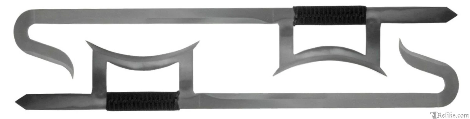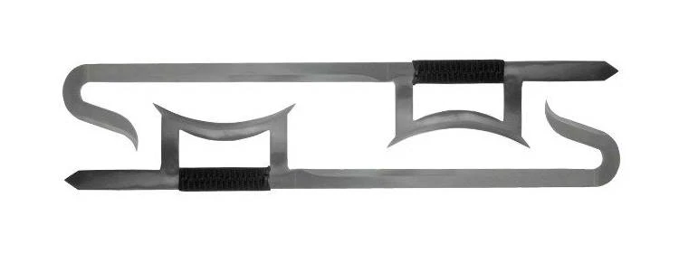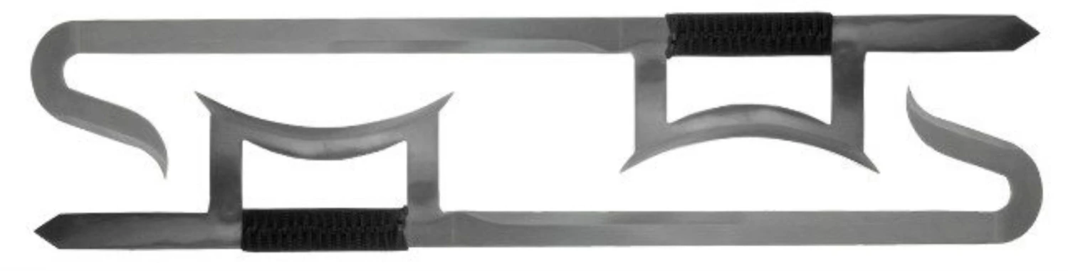 The Chinese hook swords are perhaps the most popular of rare kung fu weapons. The hook sword traces back in history to 1771 BC with only two known forms of training. One is a hard hitting approach most likely used in combat, where the other approach is visually exciting and relates to what you would see today in a martial arts movie. The hook swords are usually used in pairs so the practitioner may apply a wide array of defensive and offensive maneuvers. Aprox 33″ long.
