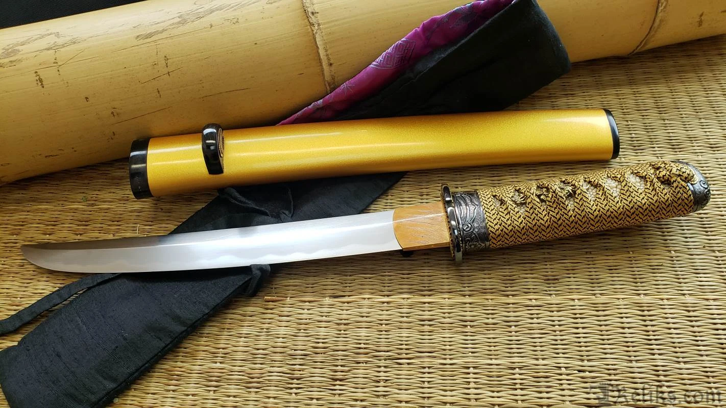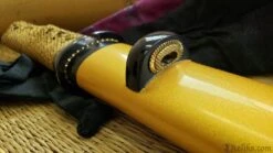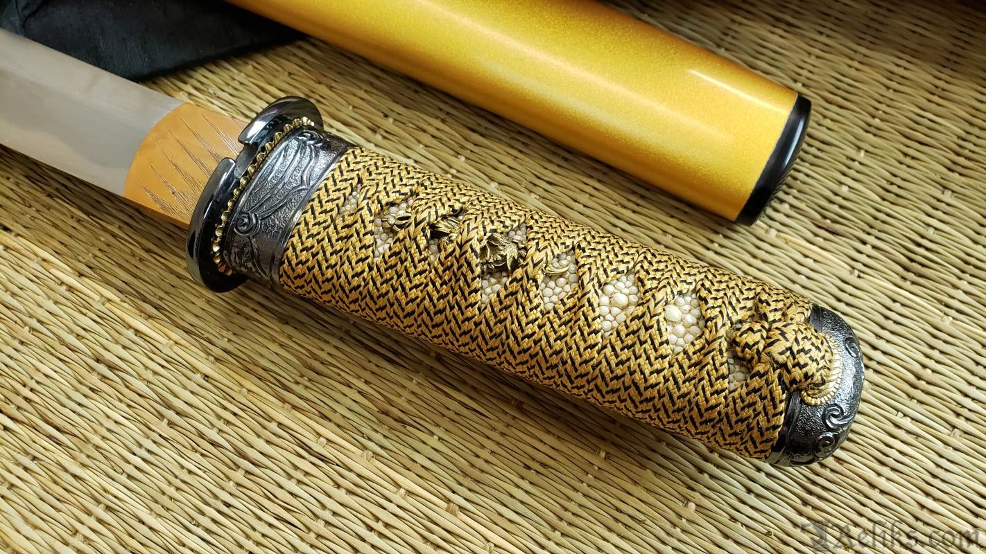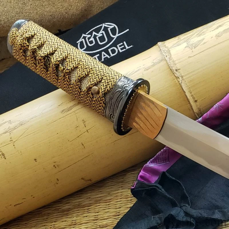 The matching Tanto for the Citadel Imperial Katana is themed in the symbolic flower of the royal family of Japan, the Chrysanthemum. In addition the golden colour of the handle and saya represent the warrior’s courage. The blade features a hand forged and differentially hardened DNH7 high-carbon steel blade. Each blade is hand polished using traditional stones and powders to produce an authentic look. Each fitting (tsuba, fuchi, kashira) is meticulously hand crafted in pure iron. Each piece is therefore slightly unique and held to a high standard of excellence. Citadel is one of only a handful of sword makers worldwide that still produces fittings in this manner. The tsuka is carved to each individual blade ensuring a tight friction fit with a full same-gawa wrap. The ito or handle wrapping is two-tone hand wrapped silk imported from Japan. The saya is a work of art in its own right, showing off the masterful lacquerwork that Citadel is capable of achieving in the excepational golden metal-fleck style. Each saya is painstakingly hand carved for the individual piece ensuring a proper snug fit.