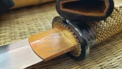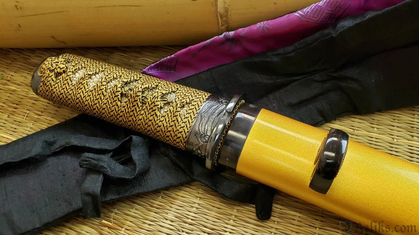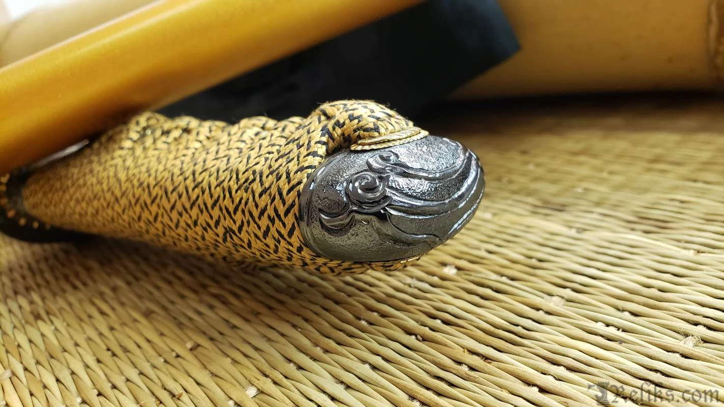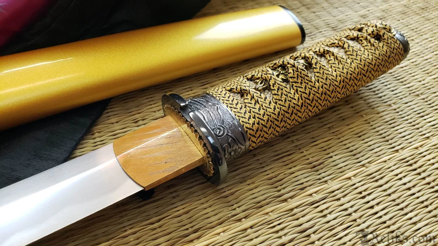 The matching Tanto for the Citadel Imperial Katana is themed in the symbolic flower of the royal family of Japan, the Chrysanthemum. In addition the golden colour of the handle and saya represent the warrior’s courage. The blade features a hand forged and differentially hardened DNH7 high-carbon steel blade. Each blade is hand polished using traditional stones and powders to produce an authentic look. Each fitting (tsuba, fuchi, kashira) is meticulously hand crafted in pure iron. Each piece is therefore slightly unique and held to a high standard of excellence. Citadel is one of only a handful of sword makers worldwide that still produces fittings in this manner. The tsuka is carved to each individual blade ensuring a tight friction fit with a full same-gawa wrap. The ito or handle wrapping is two-tone hand wrapped silk imported from Japan. The saya is a work of art in its own right, showing off the masterful lacquerwork that Citadel is capable of achieving in the excepational golden metal-fleck style. Each saya is painstakingly hand carved for the individual piece ensuring a proper snug fit.
