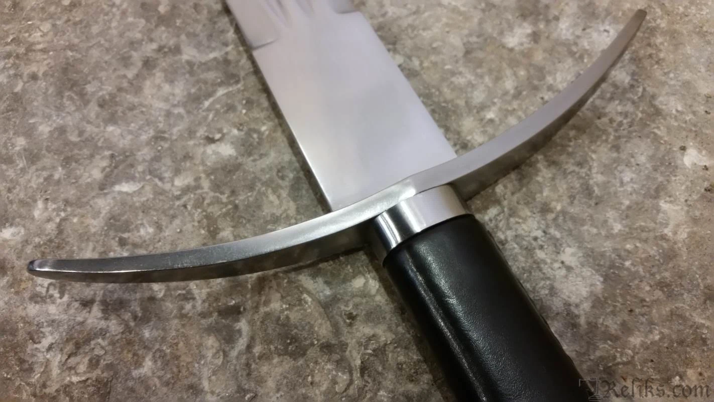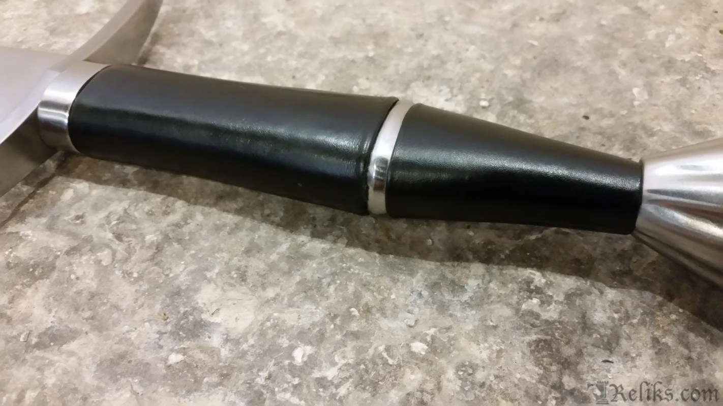 Brought back by popular demand, we are pleased to offer this Windlass Classic bastard sword. This massive broad sword could have easily been used at the Battle of Bosworth Field in 1485, cutting and slashing its way through the Tudor ranks. As large as this sword is, it is still amazingly light and well balanced. The wide blade is forged of high carbon steel, while the pommel and #cross guard have been antiqued with a darkened, aged finish. The large 7″ handle is wrapped in soft black leather with a steel separator ring and can easily accommodate two hands. Arrives sharpened from the factory.