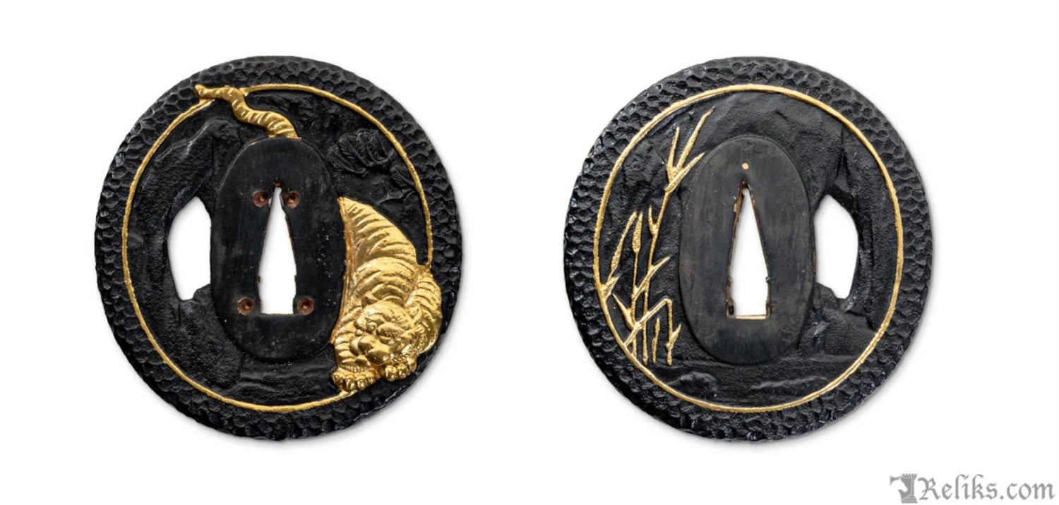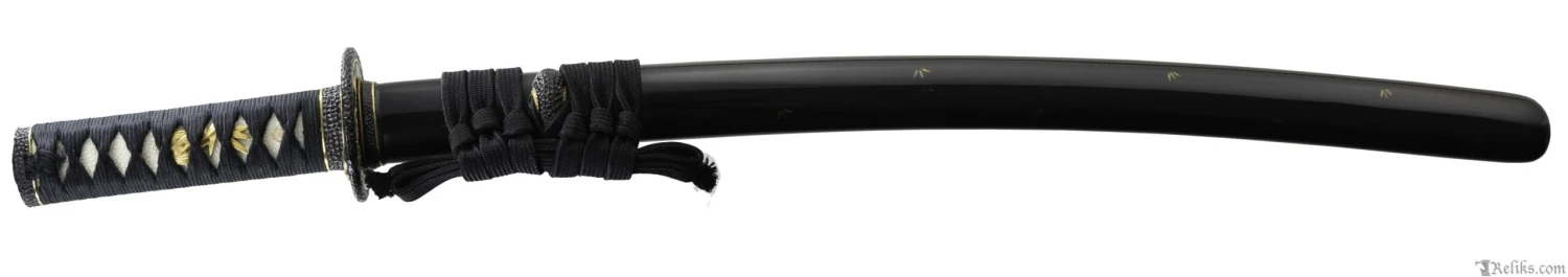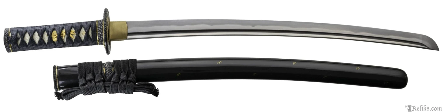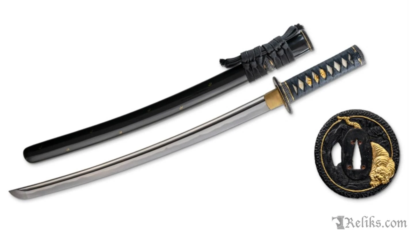 The return of a classic pairing .. our Tiger Wakizashi from Hanwei is nostalgic reissue of the original (SH1205) folded steel katana made in the early 2000s. The specifications are painstakingly reproduced for accurancy. The K120C powder steel blade is differentially tempered with a traditional claying method to the grain patter (hada) showing distinct layers. The temper line (hamon) is evident and prominent. the blade features groove (bo-hi) on both sides. The tsuba is made from blackened iron depicting a “stalking tiger” inlaid in brass. The ray skin (same) is covered on the handle (tsuka) with Japanese Cotton. The saya is deeply lacquered in black and inlaid with brass bamboo leaves.