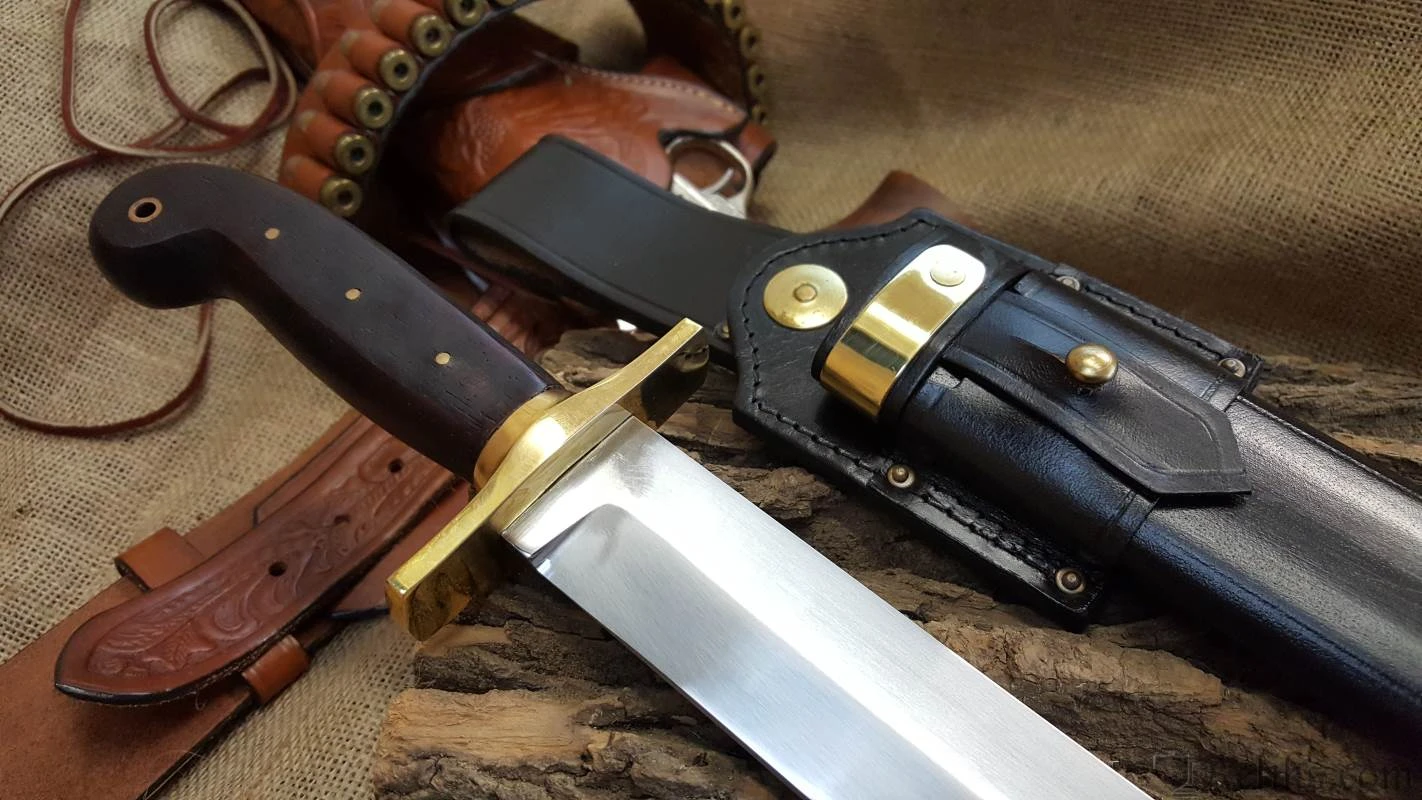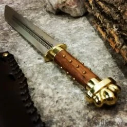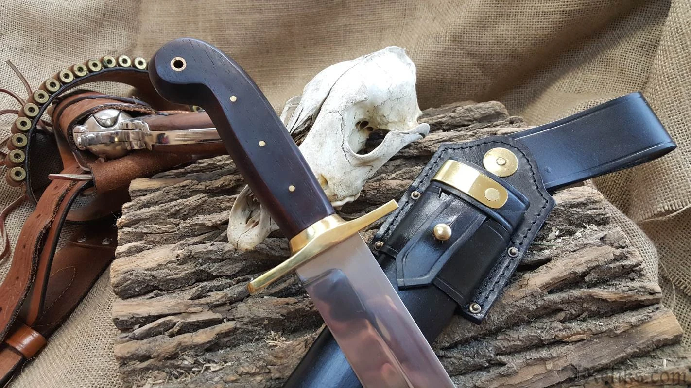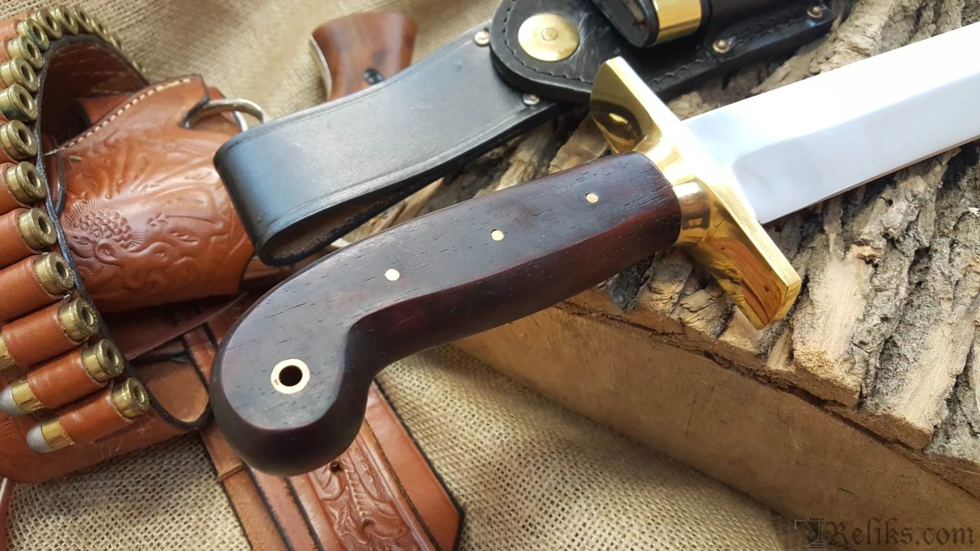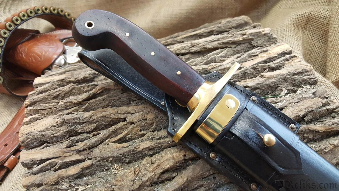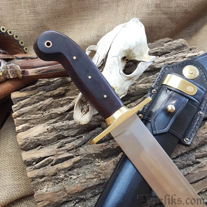 We have long admired the timeless good looks and pure functional design of the American Riflemans Knife. This rare blade was originally issued in extremely limited numbers, and has the distinction of being the first knife officially designed for, and purchased by, the U.S. Army back in 1849. Our blade takes inspiration from an antique in the private collection of Cold Steel President Lynn C Thompson, and while our blade is not an exact replica, it features many of the design nuances that make this knife such a classic! Its big, stout spear point blade is stiff enough to oppose even much larger weapons, making it an ideal complimentary knife to carry and use alongside a saber or cutlass. Plus, its beefy 12” blade and solid guard make a more than capable stand-alone blade in its own right! Its easy to see why it was chosen as a back-up blade for our nation’s riflemen. The Cold Steel 1849 Riflemans Knife is hand forged from 1085 High Carbon steel, with a solid brass guard and beautiful Rosewood handle that encapsulate the sturdy full tang. The Riflemans Knife is sold complete with a high quality hand-stitched leather sheath and belt frog, with polished brass throat and chape. Perfect for re-enactors and collectors alike. Add one to your collection today!