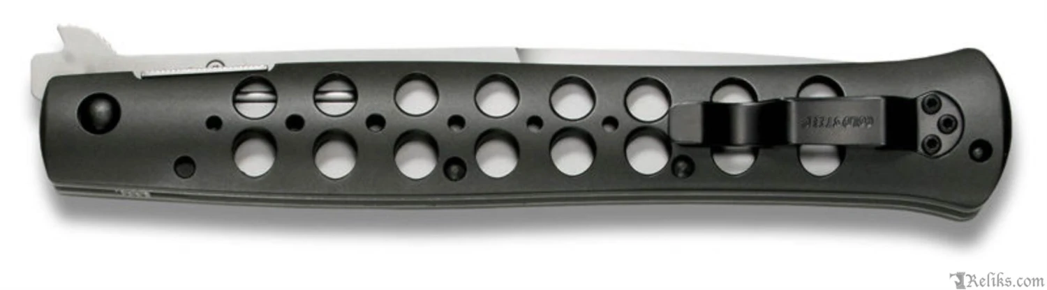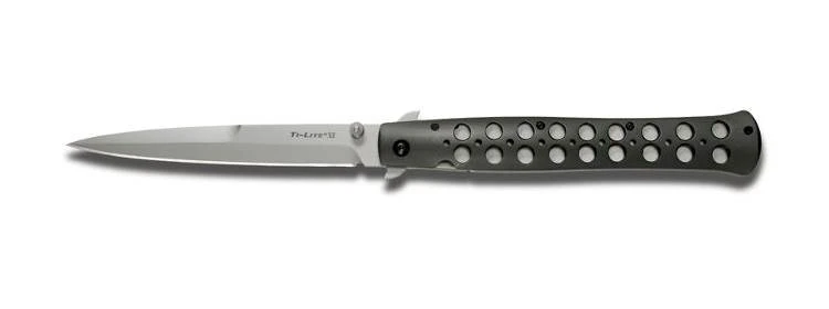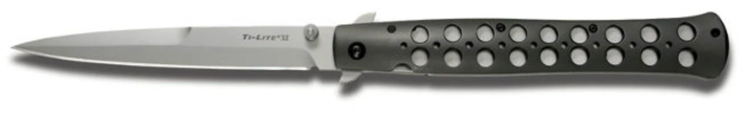 Cold Steels Ti-Lite folding knives evoke the sleek speed and rebellious lines of the classic 1950s switchblade. They feature sharp and strong bead-blasted American S35VN Alloy blades, and CNC milled 7075 Aluminum handles which are finished with a protective EDP (Electric Discharge Plating) coating. The Ti-Lites are equipped with our patent pending, stainless steel leaf spring locks (proven, in our tests, to hold upwards of 145lbs). For ease of carry, the Ti-Lites come equipped with a small, but unobtrusive steel pocket clip, and can be opened rapidly by using the thumb studs or by snagging a quillon on the edge of your pocket as you draw your knife out.
