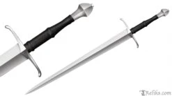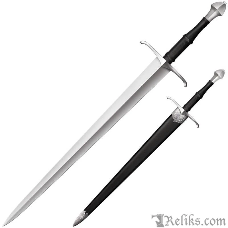 While Japanese sword cutting competitions have been popular for many decades, there has been little or no interest in exploring the cutting potential of Western swords until very recently. Now in response to this awakening Cold Steel would like to encourage it by offering our own Competition Cutting Sword. Broadly based on the Arbedo, its intended for contests using rope, mailing tubes, tatami mats and similar soft targets. The thin, wide, double edged blade is hand forged from 1050 high carbon steel with a hard spring temper and is delivered fully sharpened and polished. For maximum control and leverage, when attempting big cutting feats, our Competition Cutting Sword comes with a substantial leather covered wood handle that will accommodate one or both hands. To protect your fingers and fend off opposing blades, a simple yet effective double quillon steel guard is provided. To help counter balance its wide blade, its supplied with an attractive flared, lozenge shaped steel pommel and comes encased in a thick and sturdy, black leather scabbard with matching steel throat and chape.