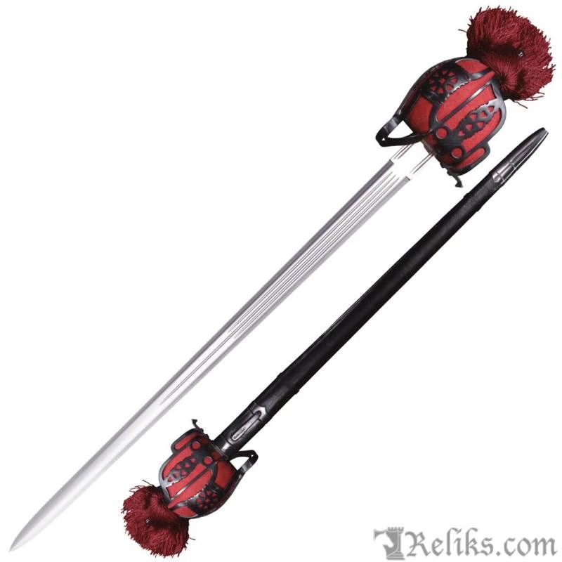 The infamous weapon of the Highland clansman, the Scottish Broadsword has a long, double-edged blade and distinctive basket hilt, and, when combined with targe and dirk, has proven to be more than a match for enemy soldiers on battlefields the world over. Cold Steel has chosen to make our own interpretation of this famous sword. Hand forged, expertly heat treated and beautifully polished with triple fullers, our blade is capable of passing the stringent British Proof test. The Swords basket hilt is made of blued steel with a wood grip covered in ray skin and wrapped in wire. Finally, the Broadsword is safely housed in a wood and leather scabbard with a blued steel chape and throat.