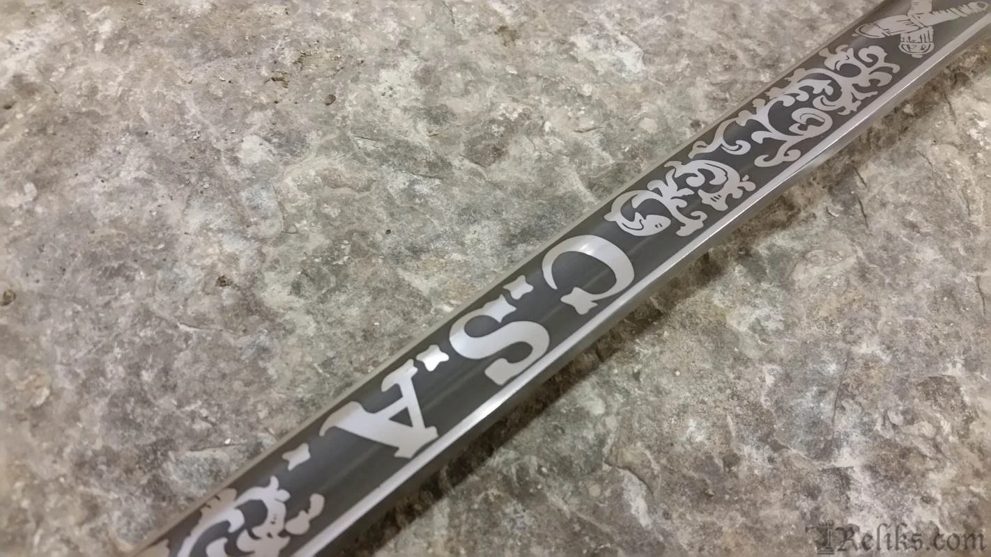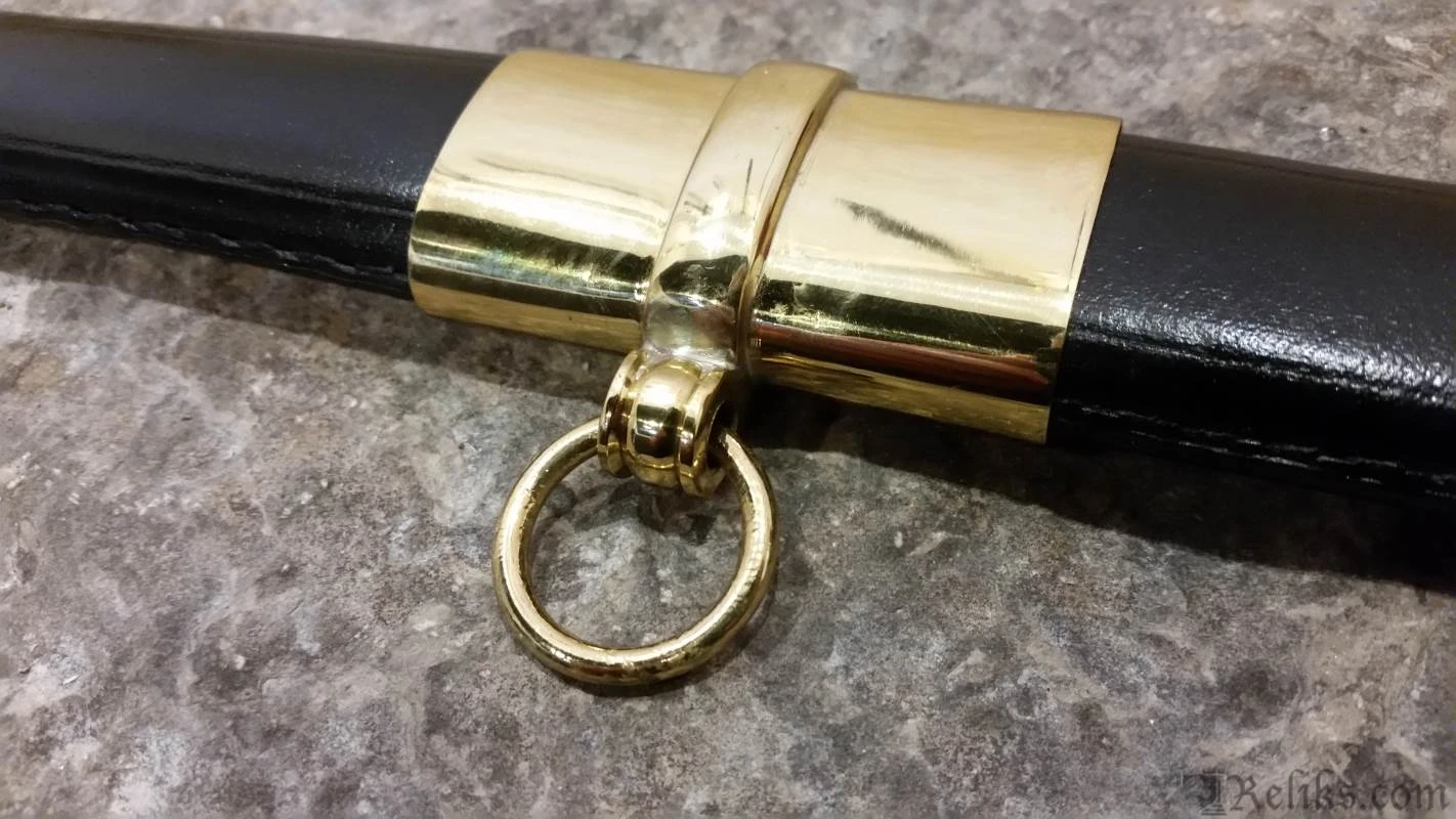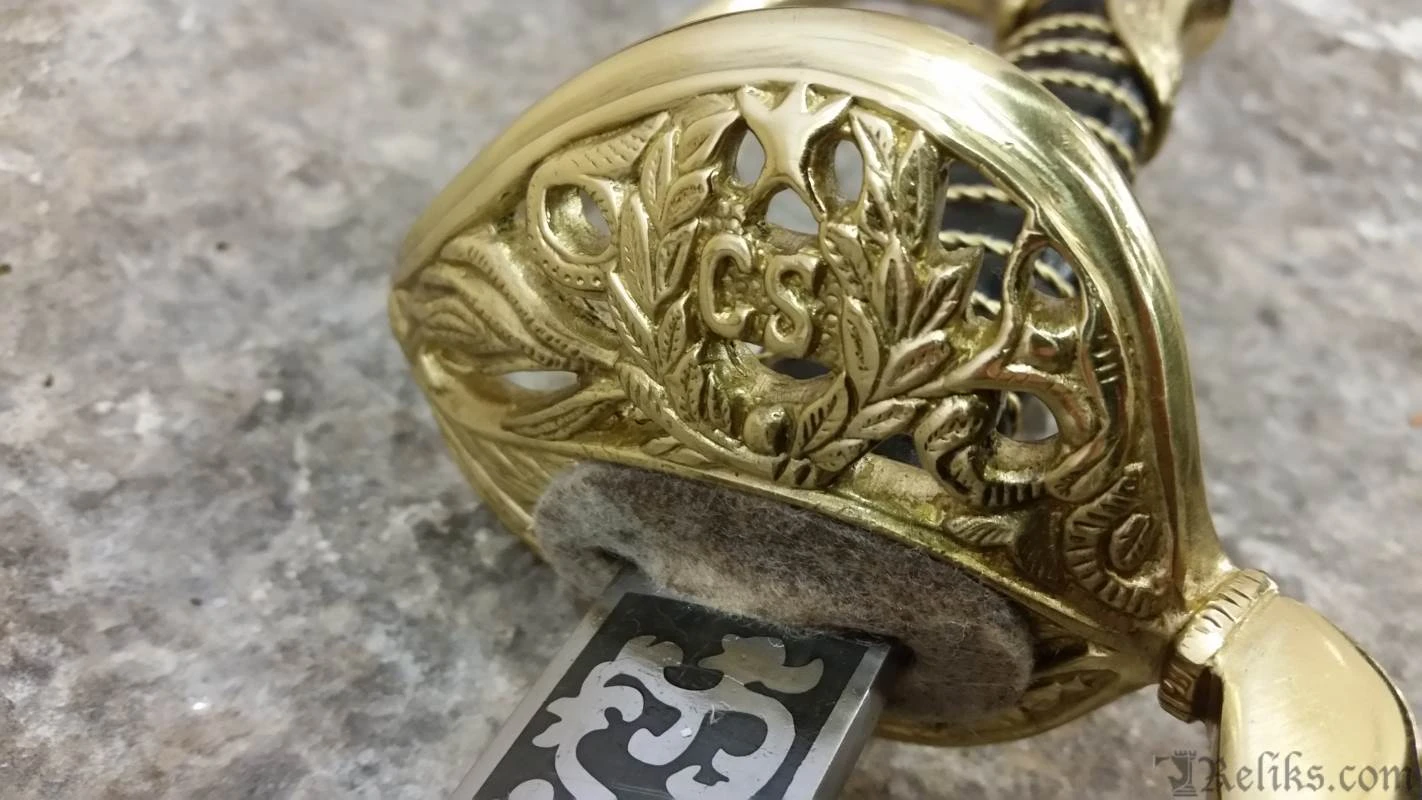 This authentic, hand made replica is hand forged and fully tempered of 1065 high carbon steel. Coupled with original handle and sheath materials to ensure it performs exactly as the originals did. Flexible, ornate blade and leather grip wrapped with brass wire. This faithful reproduction of the Boyle, Gamble and McFee sword is a beauty! The blade etching is even more detailed than on the old ones, with the heroic “C.S.A.”, cannon and battle flag all well done. The brass fittings are beautifully hand finished with precise detail. Note the five pointed star and “CS” on the knuckle bow. Top grain leather scabbard. See Albaugh’s “Confederate Edged Weapons”, pg. 9.