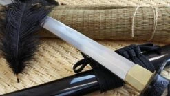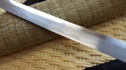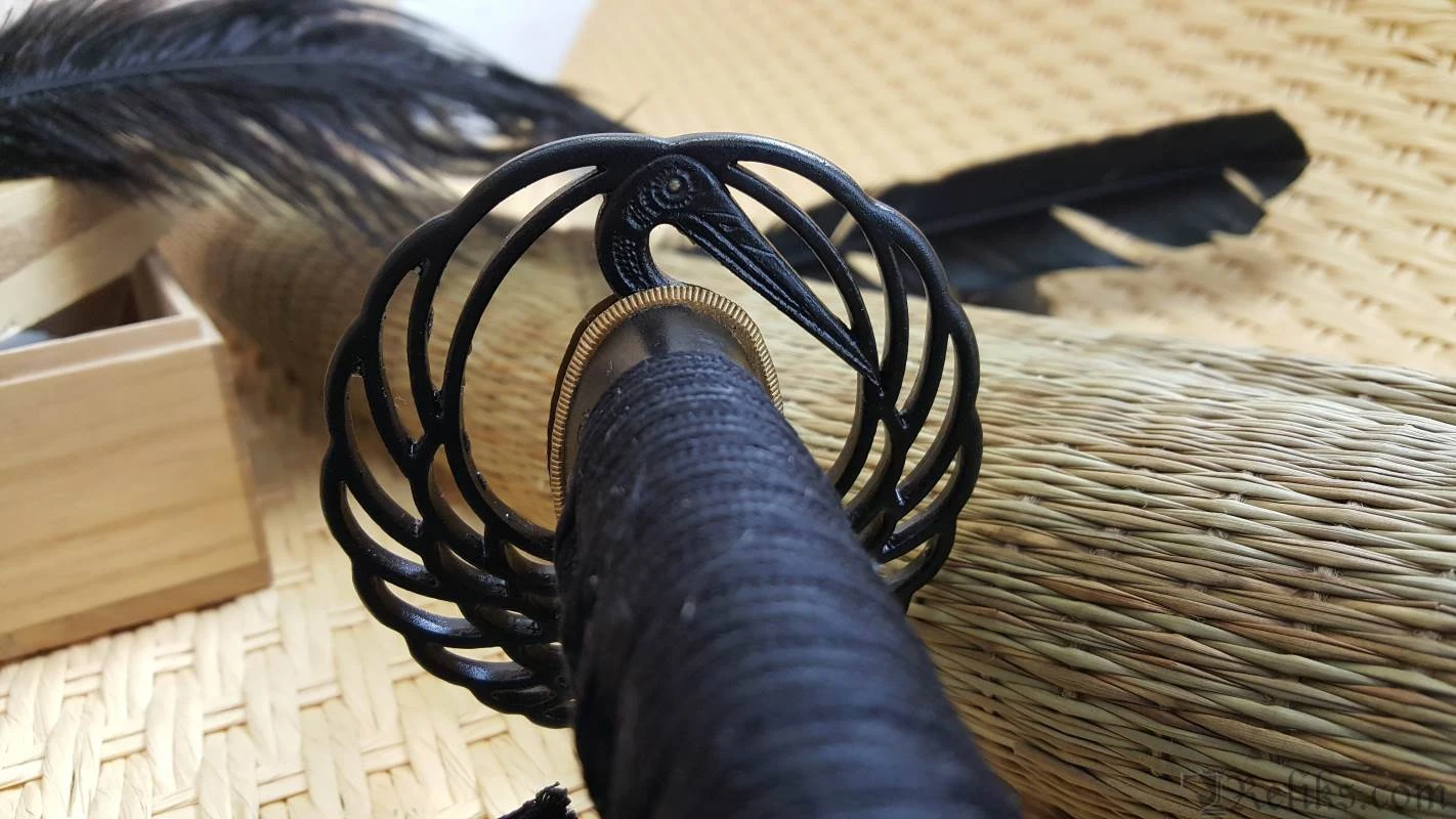 The Crane katana by Bugei is an elegant sword at a very reasonable price. The Crane tapers more towards the tip than our heavier *feeling* Samurai model. The Crane style is forged out of Swedish powdered steel with a dramatic hada, grain pattern, resulting from the forging/folding process. The tsuba, guard, is a pierced crane style and quite beautiful. The Crane symbolizes wisdom and longevity. The menuki are a younger and an older scholar/sage. The meaning is this, a man of wisdom and integrity would be long in the service of his lord, usually surviving one lord to serve the next generation, thus the analogy with the Crane, wisdom and longevity. This sword will serve well those who want a faster blade for iaido and yet still want a blade that has the strength for serious cutting. The nakago on the Crane Katana is ten inches in length with two mekugi securing the tsuka, handle, to the nakago, tang. The tsuka is wrapped in black silk ito. Like all of our swords many different blade and tsuka lengths are available providing a great deal of choice to fit each individuals’ needs. As with all of Bugei’s swords, each Crane katana is inspected and prepped by Keith Larman to insure the quality of the sword that you receive from us. The beautiful hada (grain in the steel) is very apparent in our swords. This is the result of the extensive forging and folding process that is done by hand for each individual sword. The Crane tsuba is extraordinary in it’s beauty and detail. It is a light tsuba and adds to the overall lightness of the blade.