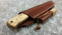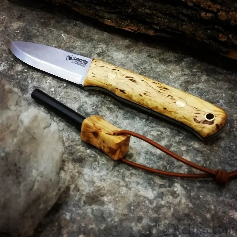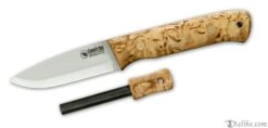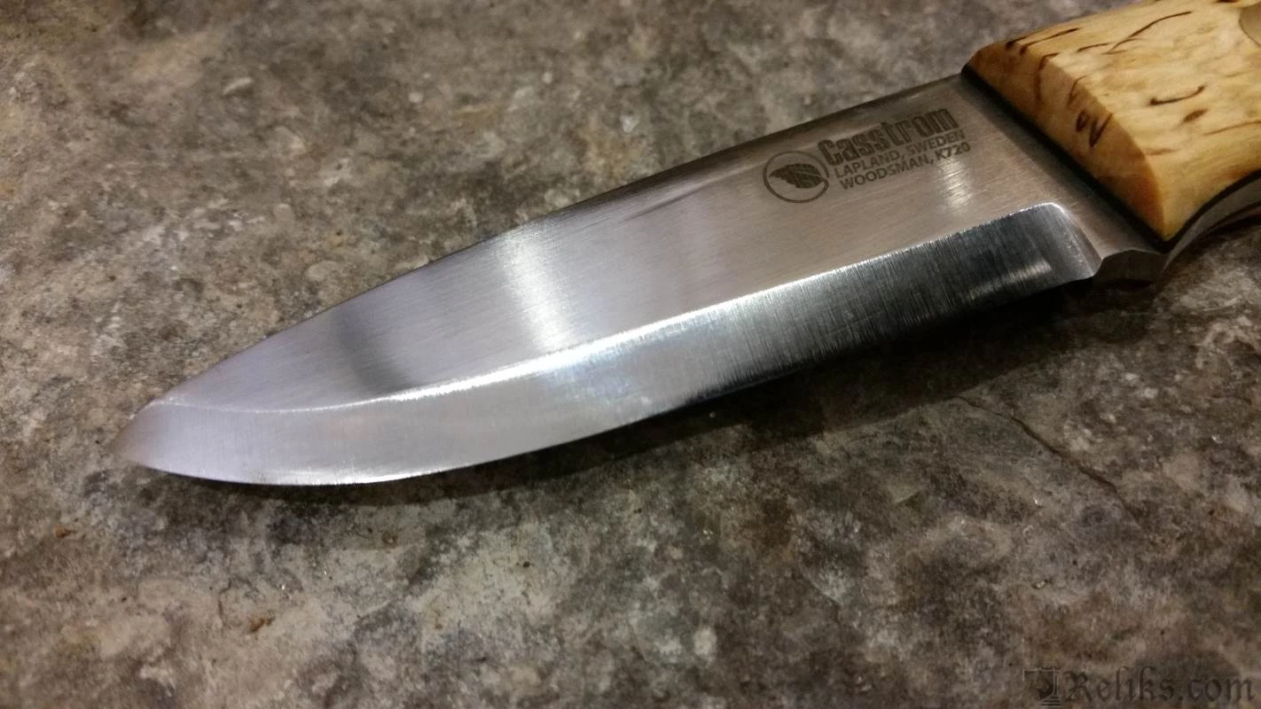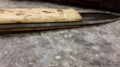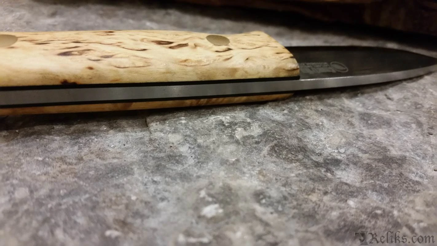 The knife has a Scandinavian grind to make it very robust at the same time easy to carve wood with and easy to sharpen on a small flat whetstone/sharpener in the forest. The knife is a really good all-round tool for field use.