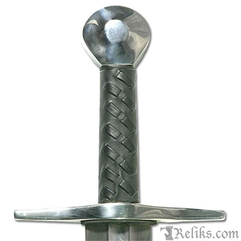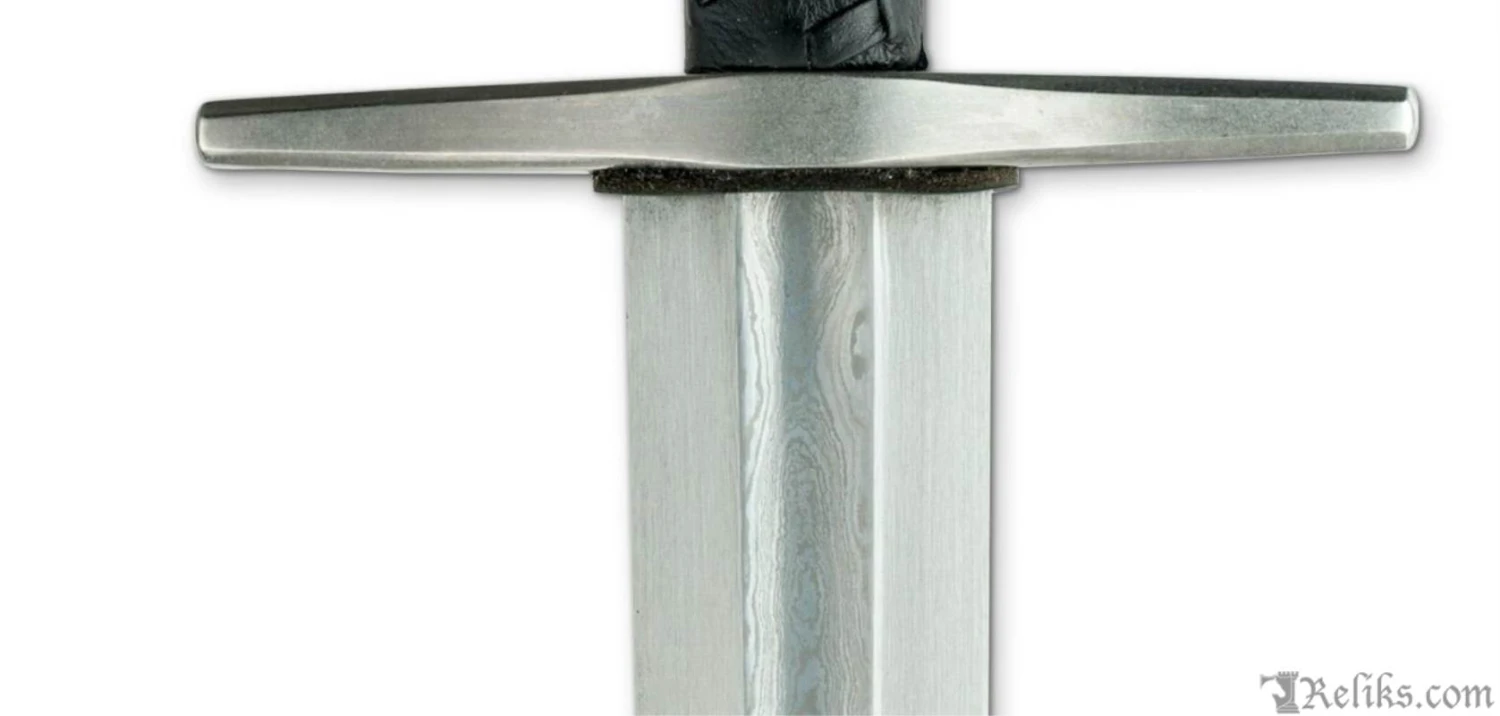 Our damascus William Marshall sword raised the bar for quality of construction and authenticity in a broadsword reproduction. The sword is based on an original damascus sword used by Sir William Marshall, one of Englands finest knights. This version of the Marshall sword is equipped with a forged and folded damascus Swedish powder steel blade. The sword blade features a central ridged #fuller and full-length distal taper – a tough test for the blade smith but resulting in a superb combination of speed and strength. The grip is leather wrapped and laced and the guard and pommel are elegant in their functional simplicity. The scabbard is leather-covered with steel mounts.
