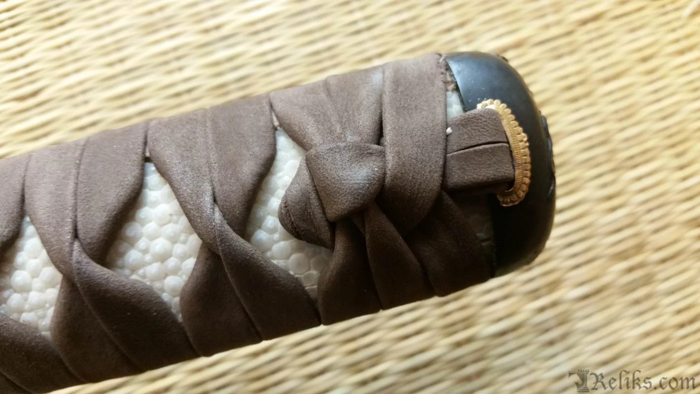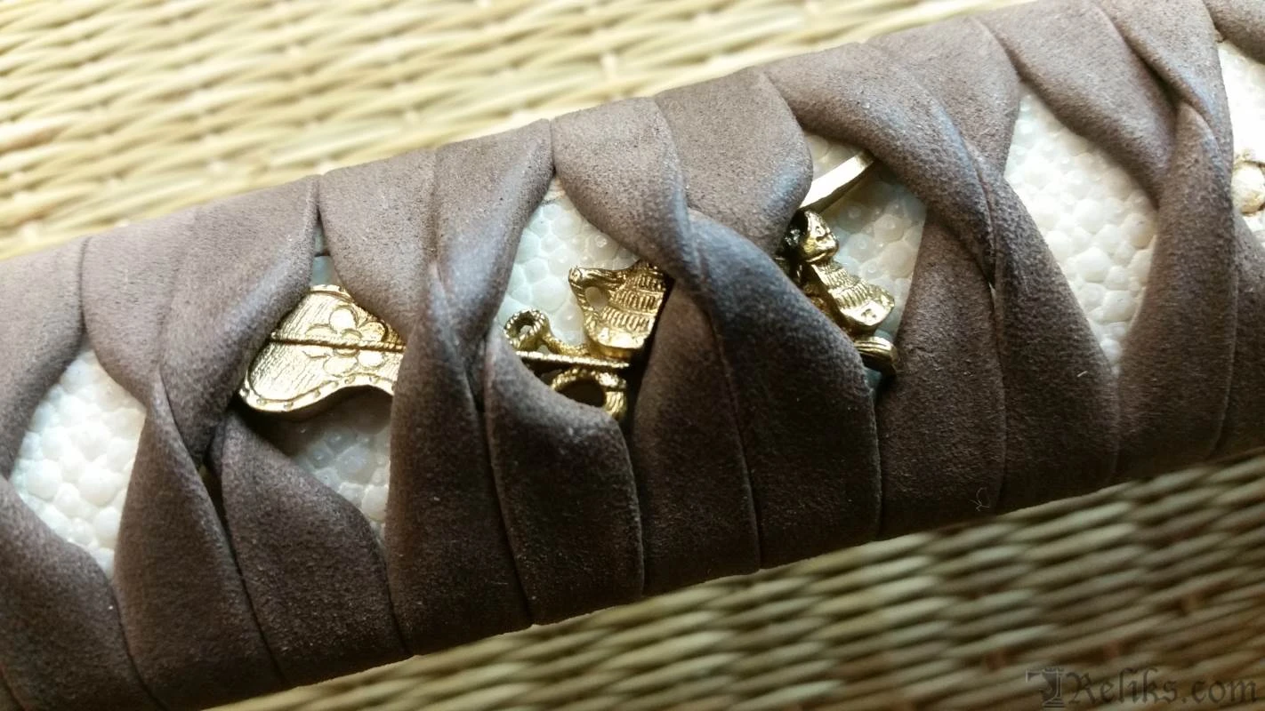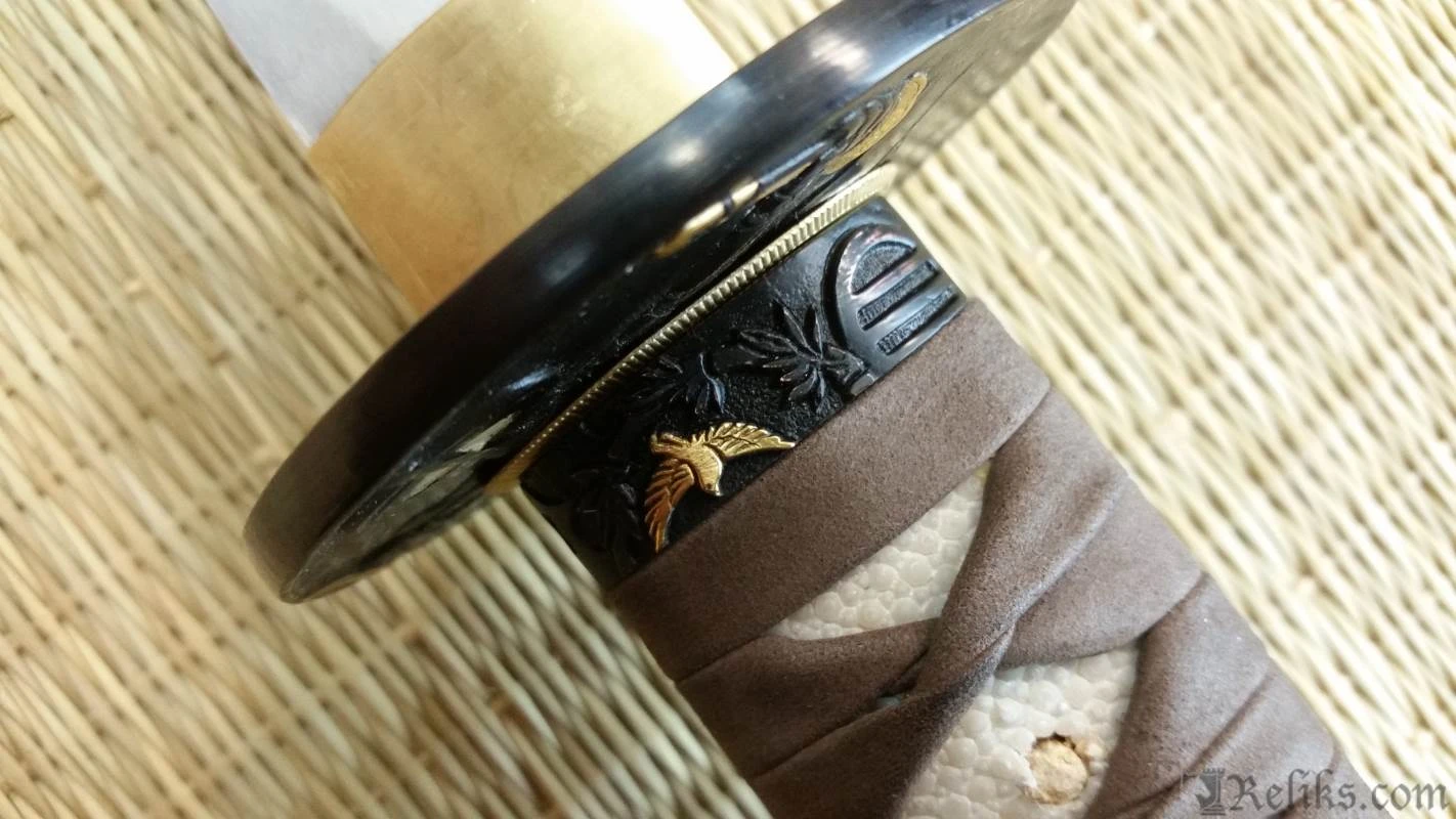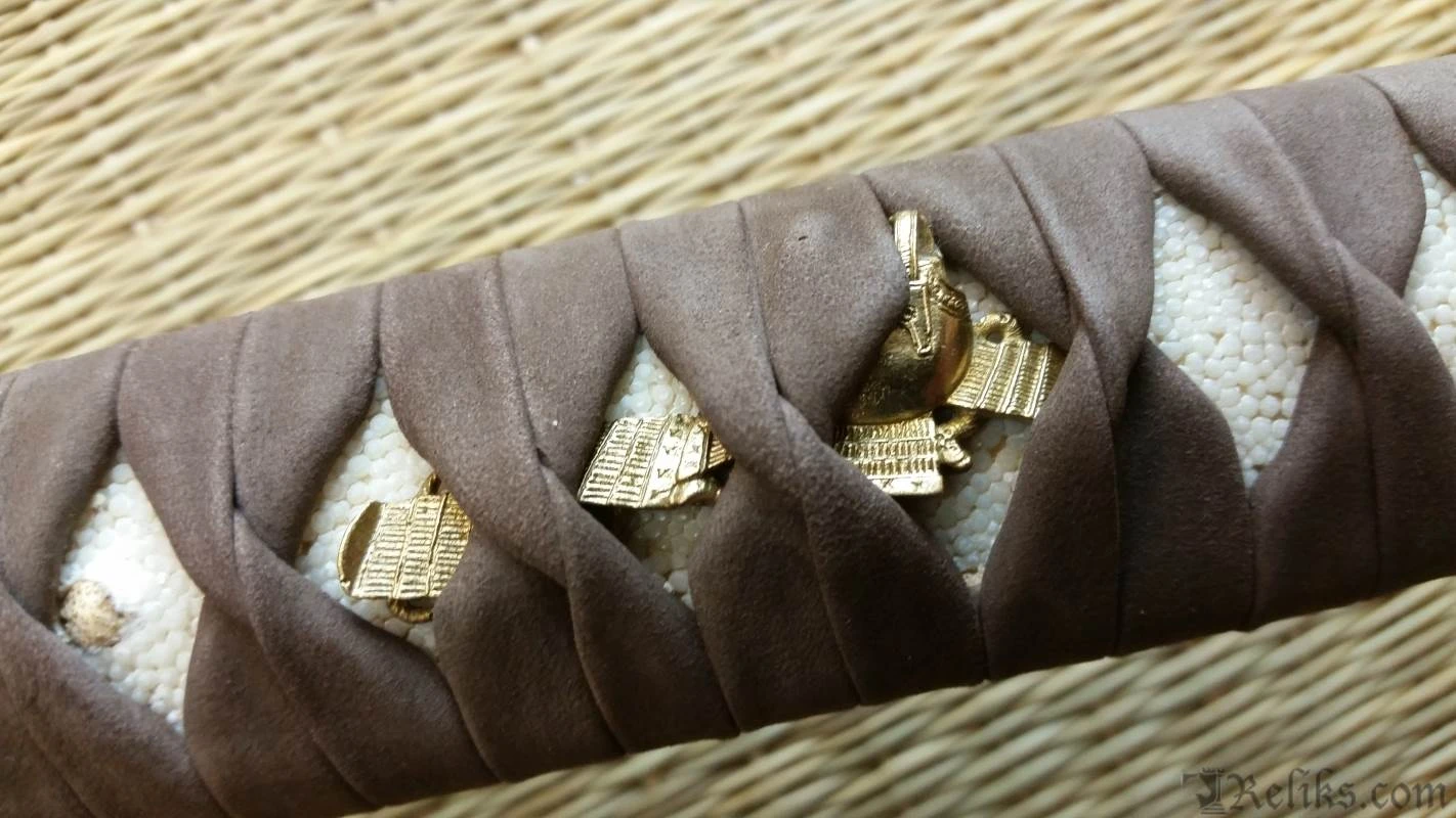 The artisans at Hanwei pay homage to the One-Eyed Dragon of Oshu, Date Masamune. Known for his signature audacious Crescent Moon kabuto and black and gold armor, his legacy is one of conquest by blood and steel which was contrasted by a reputation of being forward thinking, cultured, diplomatic and sympathetic to foreign causes and Christianity. Our Date Masamune Katana features the classic Hanwei tsuba of him holding a war fan while the blade side features soldiers with firearms. The kashira is embossed with a blackened one-eyed dragon which is contrasted by the kashira with a gold embossed falcon. The tsuka is wrapped in brown suede around a white same (ray skin) which feels incredibly great in the hands. The meticulously detailed gold menuki of Dates war and kabuto on one side and his breastplate and shoulder armor on the other put this sword over the top. The 27 ¼” forged steel blades possesses a prominent and deep hamon and well balanced for cutting or collecting. A black textured saya prevents smudging or finger prints and is contrasted with a brown cotton sageo and buffalo horn kurikata and kojiri.