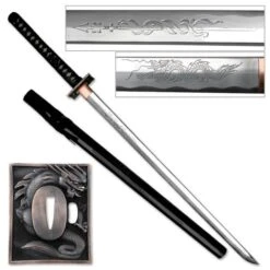 The secrets of the covert ninja or shinobi have been steeped in myth and legend since Feudal Japan. Their functions included espionage, sabotage and assassination. The tools of their trade were nunchucks, blowguns, throwing knives and the most prized…the Ninja Sword. The Dragon Ninja Sword depicts all the imagery of the legendary warrior in an economical alternative for learning techniques and light cutting. This ninjato is 41″ overall with a polished 28″ high carbon blade. The 7mm thick blade also features etchings of both the dragon and a spear. The handle is black cotton wrap over real ray skin with zinc alloy dragon tsuba. Includes black lacquer scabbard.