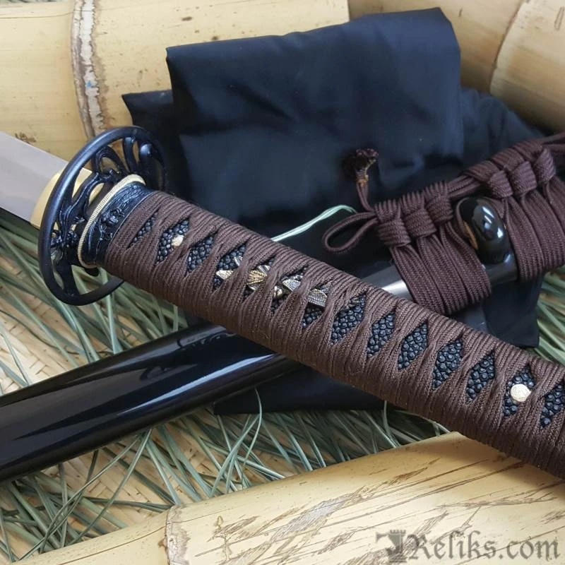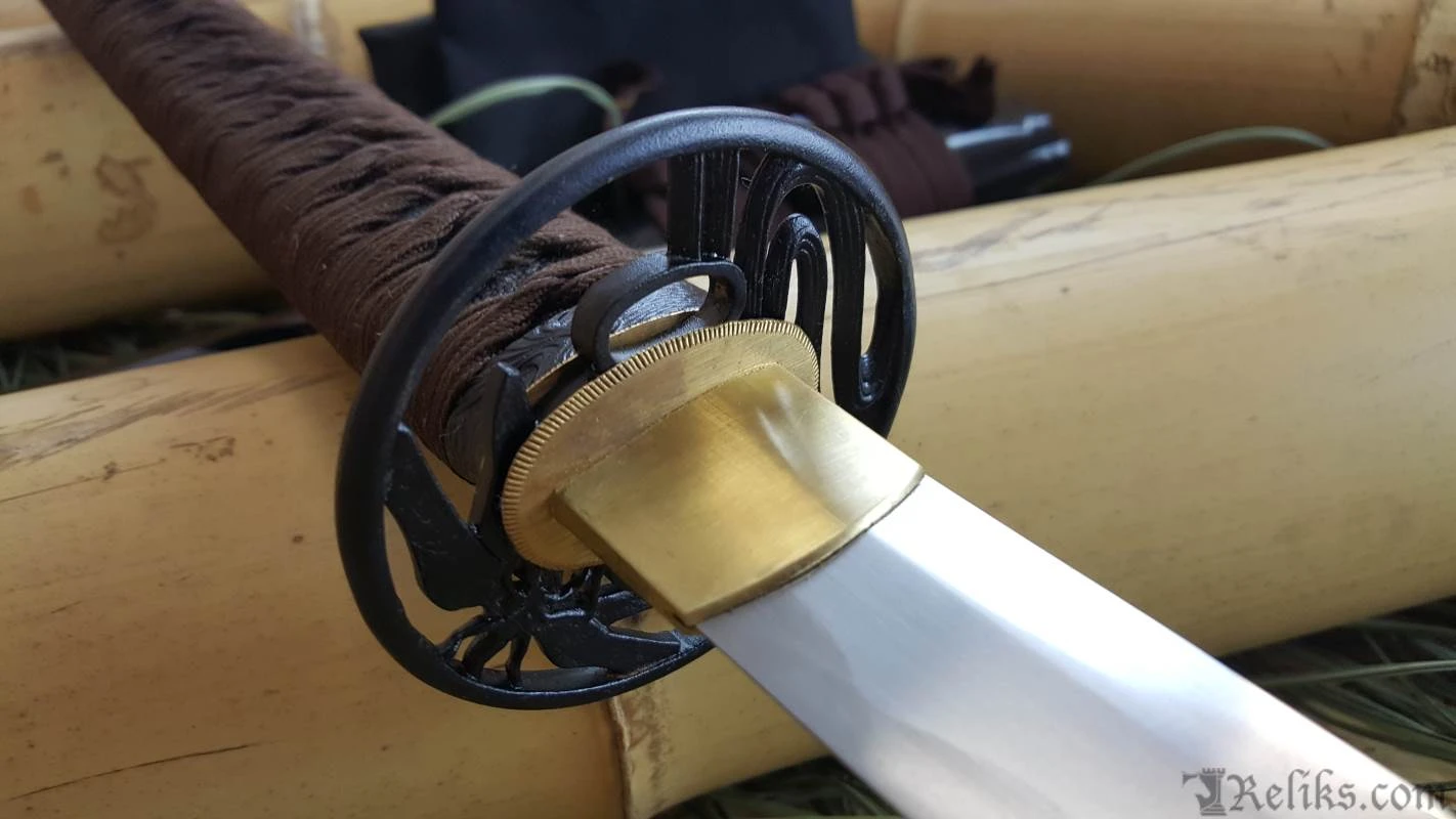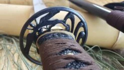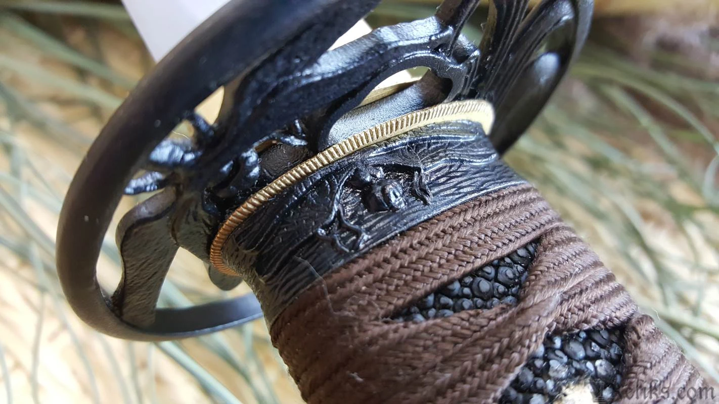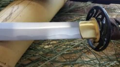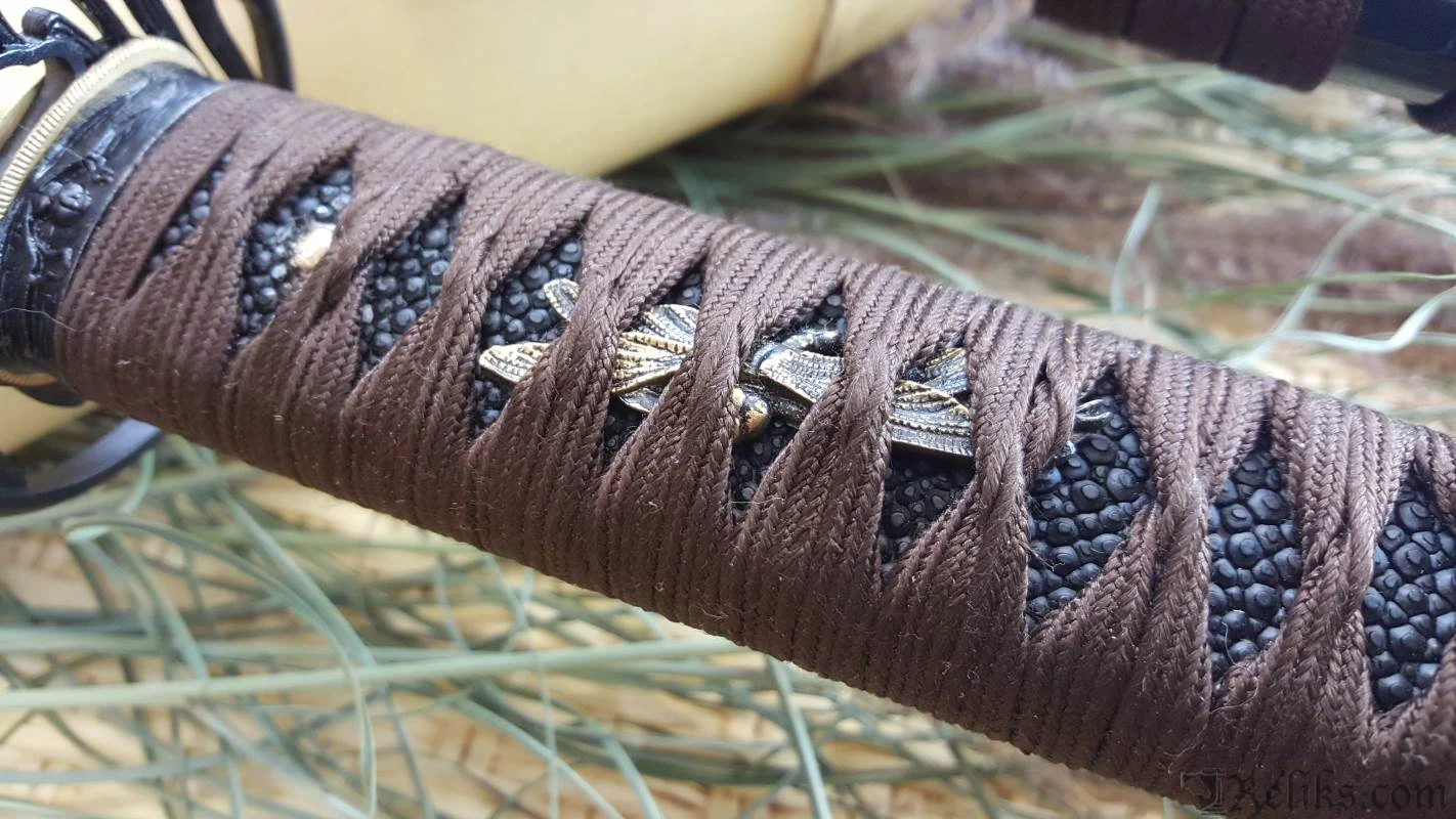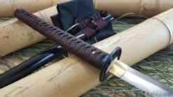 The Dragonfly koshirae katana has a distinctive style, a thinner lighter blade individually hand forged and folded from the superior Swedish Powdered Steel and very affordable. Our work with Hanwei continues to produce swords of the highest quality, the best value for the money. All of Bugei swords are tested extensively before they are put into production. We make sure that our swords perform as good as they look. The Dragonfly held a special significance to the Samurai. Their seemingly tireless movement reflected the Samurais desire to give tireless service to his feudal Lord. The dark brown ito is set off by the black same making this a unique offering from Bugei. The lower shinogi and the scant hira-niku make this blade lighter and faster and gives it less resistance in cutting soft targets. The tsuka has the slight “waisting”, ryugo, that is popular with many who study Japanese sword arts. The fittings are beautifully antiqued duplicating the look of old iron. Ted Tenold is responsible for the design and authenticity of these fittings and we think that they are the best that Bugei have offered.