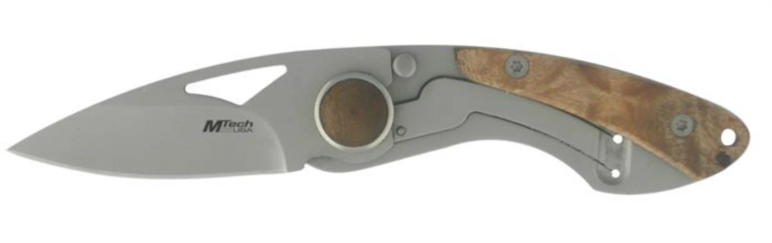 This pocket knife is 3″ closed with a 1 3/4″ blade in a matte finish 440 stainlees steel. It features a frame lock design with Maple Burl wood overlay and includes a pocket clip.