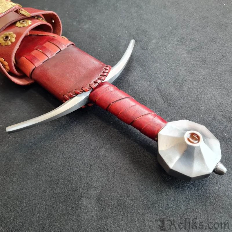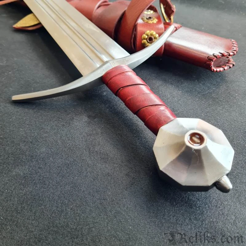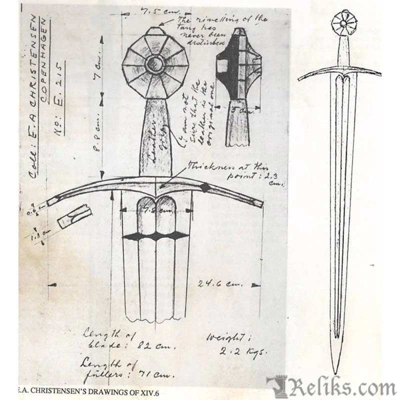 Gammelt Jern sword, 13th C (based on XIV model) This is a very distinctive sword type which by its incidence in works of art can be given a more than usually precise life-span between c.1275-1340. Its characteristics are a short grip and comparatively short blade which is broad at the hilt and tapers strongly to a sometimes very acute point with a generally flat section fullered in its upper half. Cross tend to be generally quite long and slightly arched, while the pommel is a Type K facetted. Type: XIV Find-place: Somewhere in Denmark Collection: Nationalmuseet, Copenhagen. DeepeekaÂ’s replica comes complete with a scabbard, has a full tang, and is heat treated to a Rockwell of 48-52.