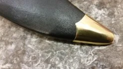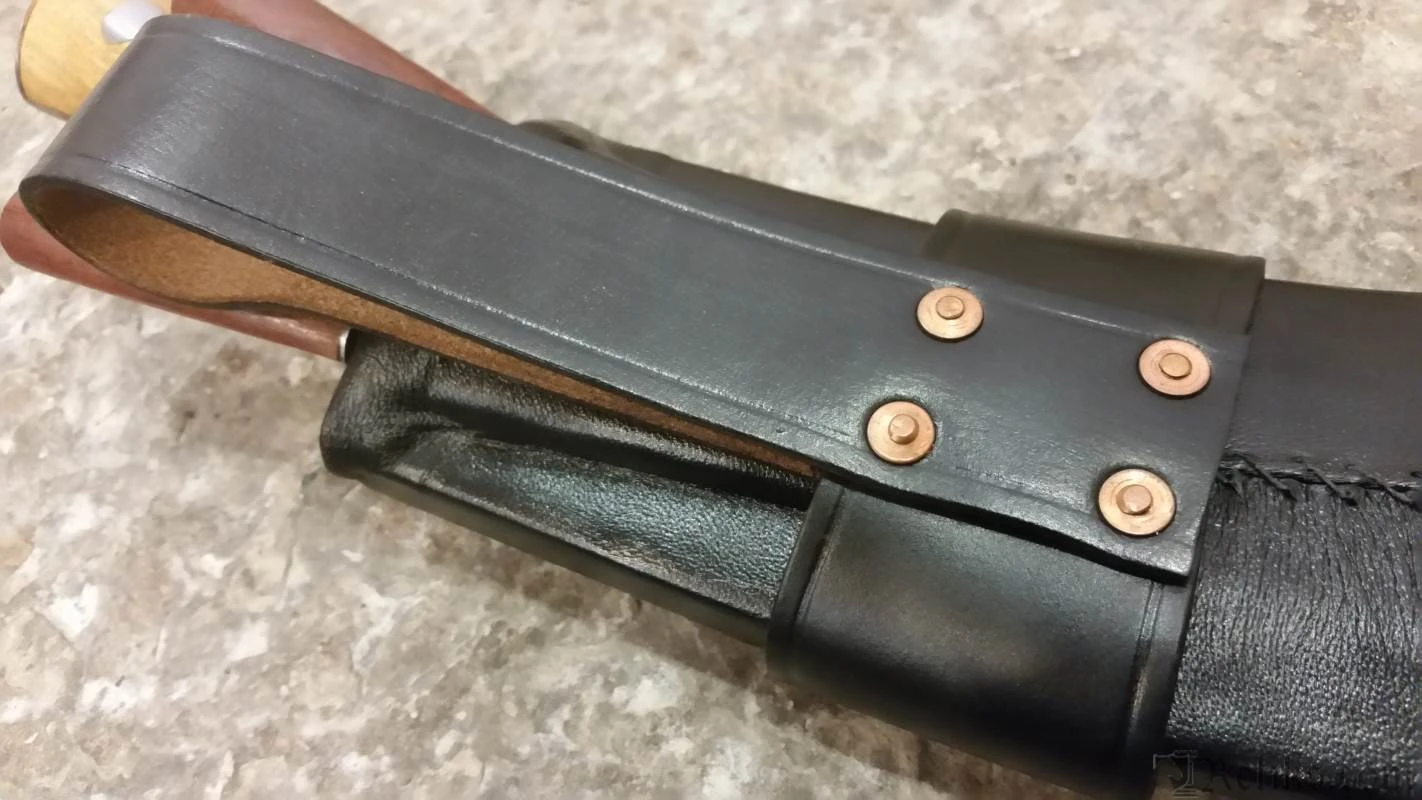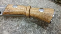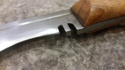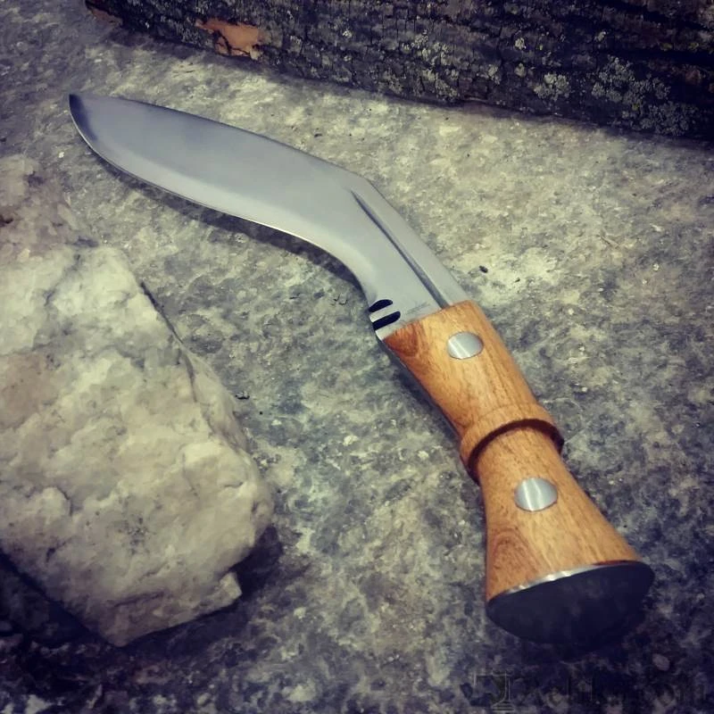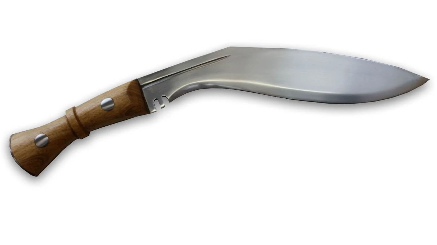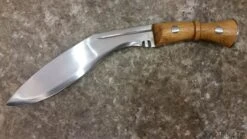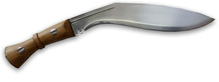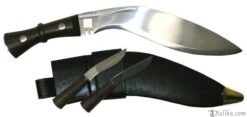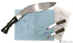 Made by the government contractor Windlass Steelcrafts. Hand forged from high carbon steel. Each comes with regulation sheath. Used with devastating effectiveness by the famous Nepalese Gurkhas in the Siege of Delhi in 1857, in the trenches of WWI France, throughout the New Guinea jungle in WWII, and with distinction in the Falkland Islands. The 12″ blade is an impressive 1/4″ thick with deep grooves and the traditional religious notch. Takes a good, sharp edge. Scale tang. Traditional, native hardwood handle. Standard metal butt plate. 17″ overall. Wt. 1 lb. 6 oz. Genuine military issue to Gurkha Regiments in India. The only Kukri on the market that comes with a copy of the 8-page government contract, the ordnance drawing and spec sheet. Includes accessory knives. Color may vary on wooden handle.