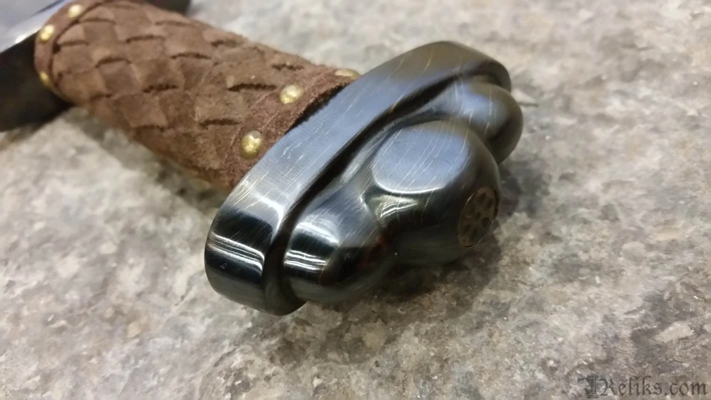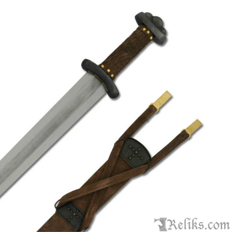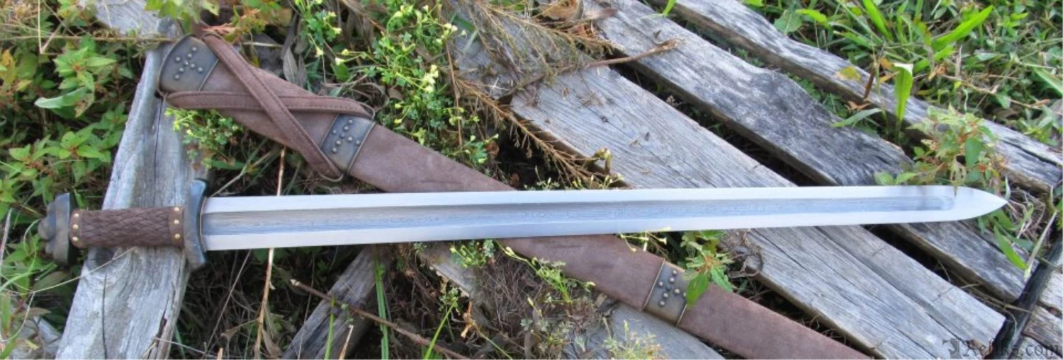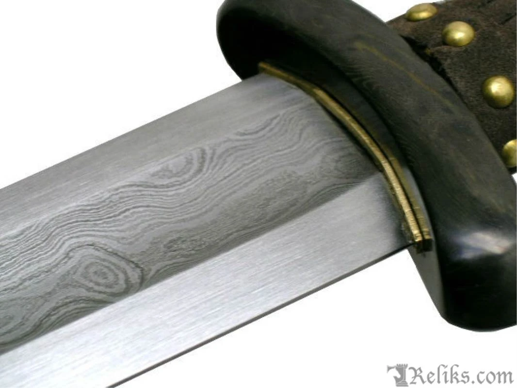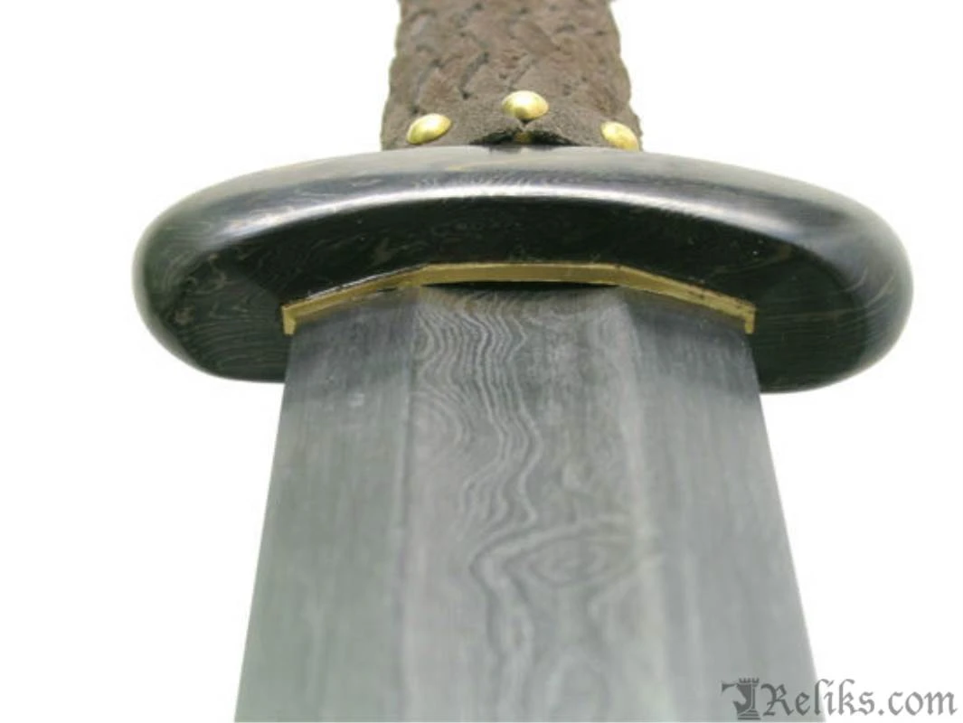 Named for the feared 8th century Viking raider, our Godfred Sword is built around a beautifully patterned folded steel blade to replicate the pre-9th century originals. The interwoven leather grip, complemented by a Damascus guard and pommel, is matched by the leather-covered wood scabbard with bronze detailing and integral belt hooks. Superbly balanced, due to the deeply #fullered distal tapered blade profile, the Godfred Viking Sword is a true tribute to the legendary Norse smiths.