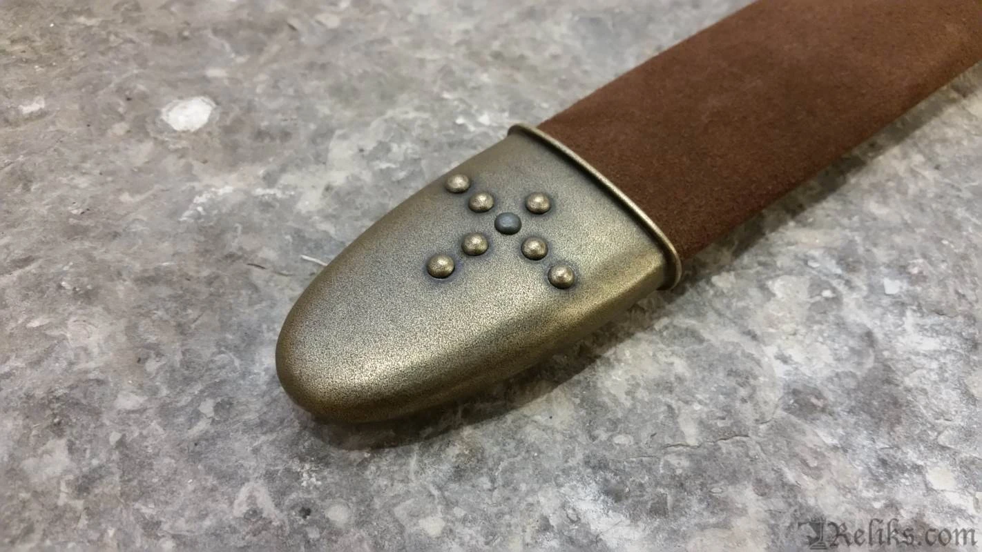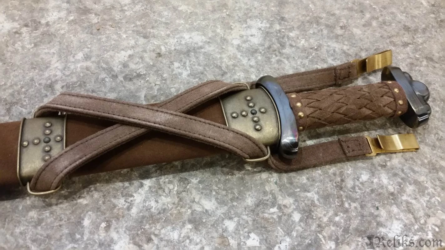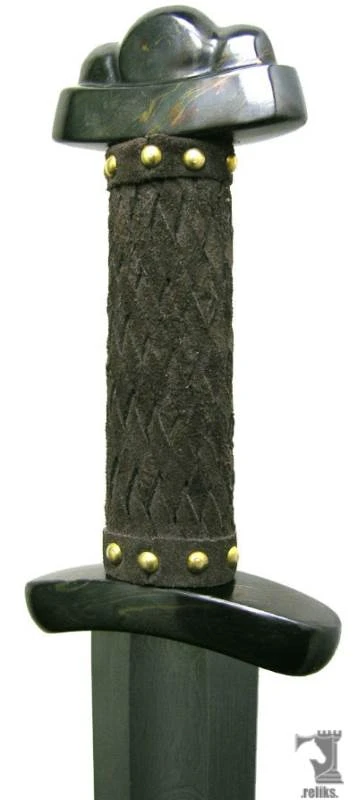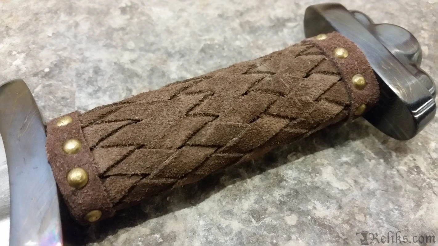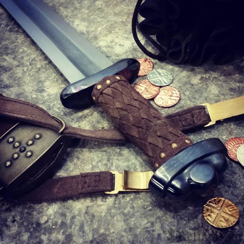 Named for the feared 8th century Viking raider, our Godfred Sword is built around a beautifully patterned folded steel blade to replicate the pre-9th century originals. The interwoven leather grip, complemented by a Damascus guard and pommel, is matched by the leather-covered wood scabbard with bronze detailing and integral belt hooks. Superbly balanced, due to the deeply #fullered distal tapered blade profile, the Godfred Viking Sword is a true tribute to the legendary Norse smiths.