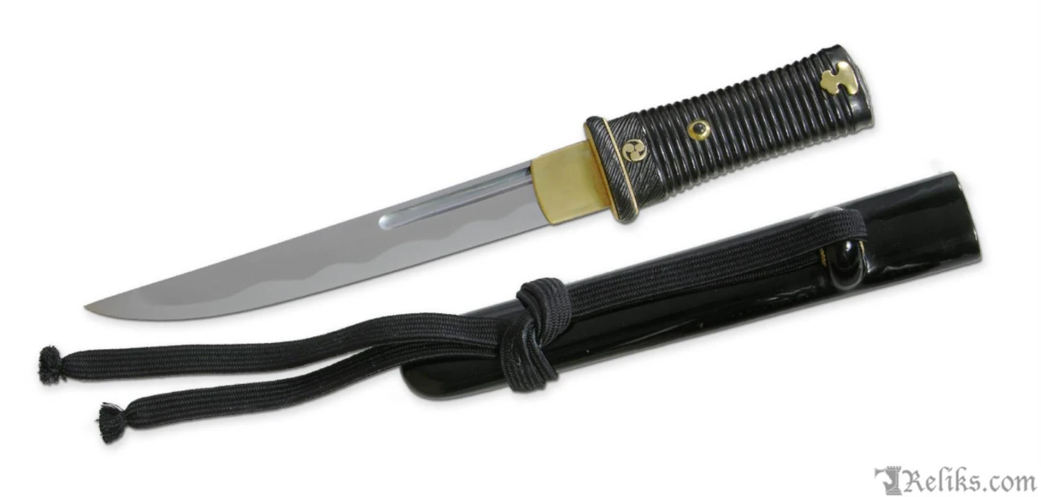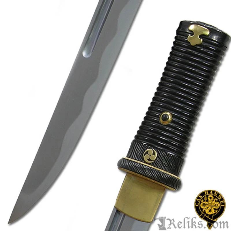 The Great Wave Tanto from Paul Chen of Hanwei displays the Tomoe motif used frequently for family crests and shrine decoration. The koshirae are crafted in blackened iron and feature the Tomoe mon. The blade is hand-forged from T10 high-carbon steel and is differentially hardened to produce a distinctive hamon. The tanto’s tsuka is crafted in ribbed buffalo horn and the saya is deeply lacquered in black.