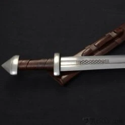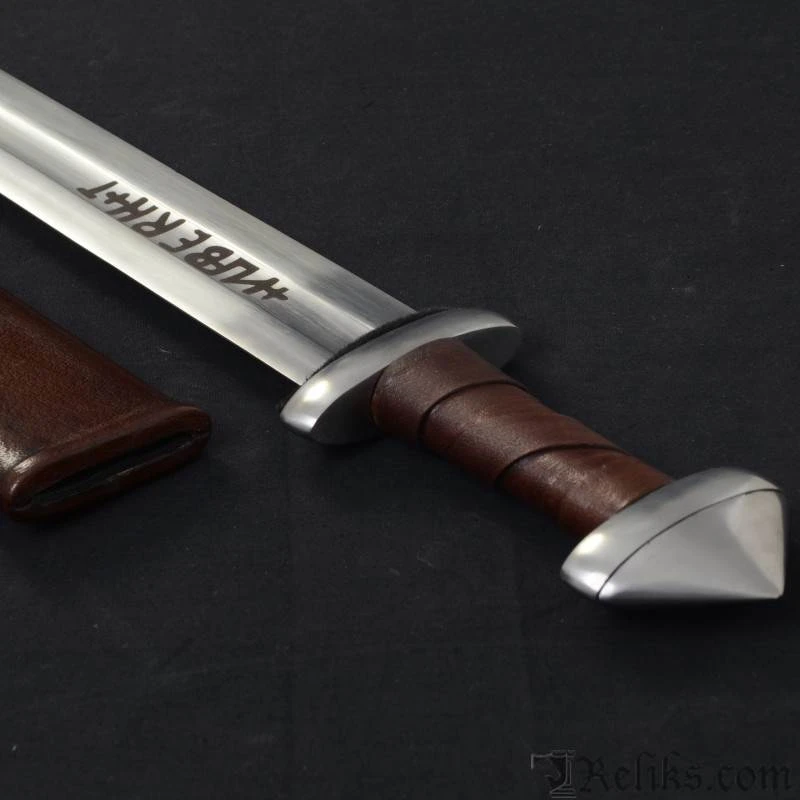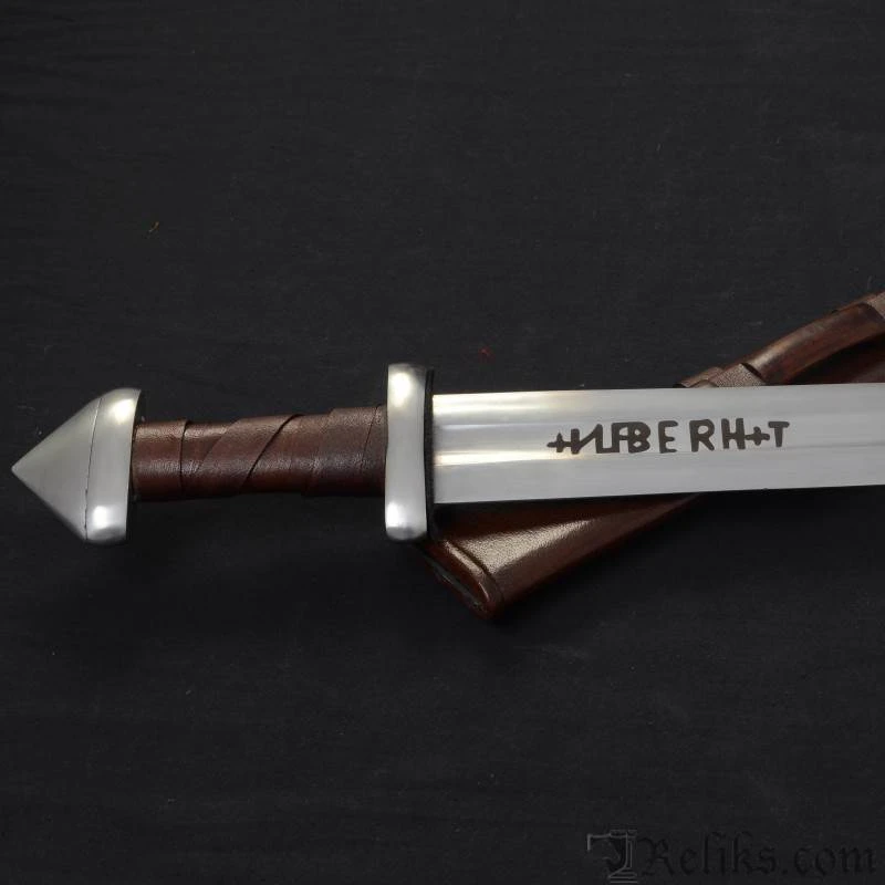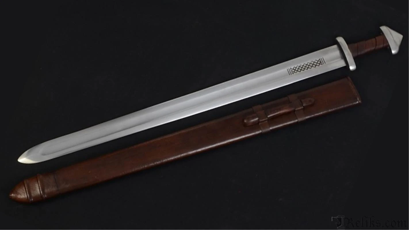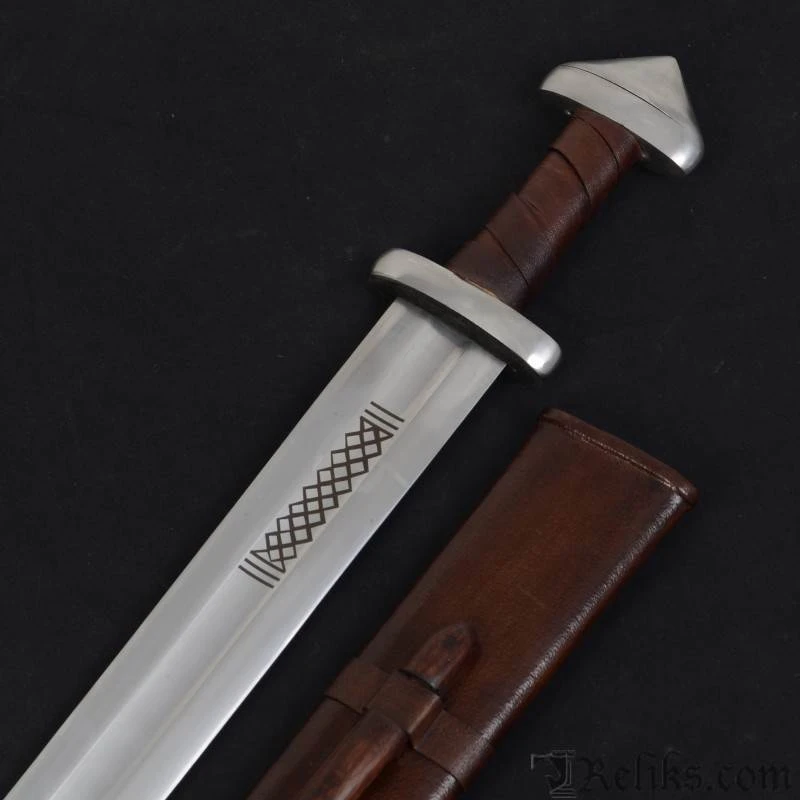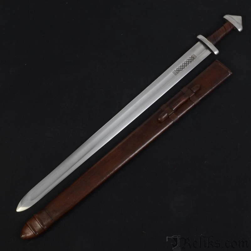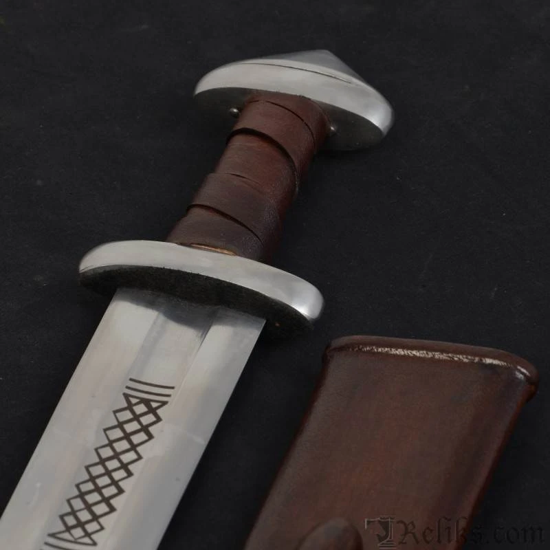 This sword is difficult to classify, because as per J. Peterson, type H and type I are often related. The main difference is size of the cross guard and pommel base. Majority of the H/I swords were from the Birka Barrow Cemetery, in present day Sweden. These swords are dated from the early 9th to the middle of the 10th c. This particular sword was found in 1949 during D. AvdusinÂ’s excavation of Barrow L-35, which contained a double cremation burial. On one side of the blade there is an ULFBERH+T mark and lattice weave on the other. There are traces of brass/copper found on the pommel suggesting copper coating. Another find suggests that the upper and lower surface of the crossguard were covered with plates of about 1mm, made of brass. The plates were attached to the iron framework by two rivets. DeepeekaÂ’s replica comes complete with a scabbard, has a full tang, and is heat treated to a Rockwell of 48-52. Our blades are made out of high carbon steel.