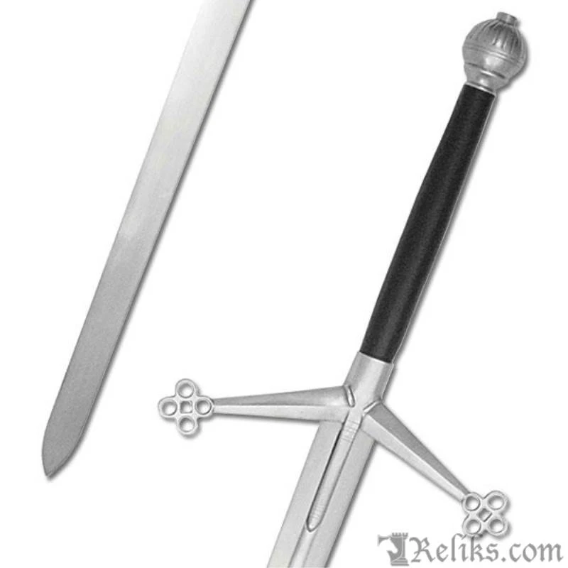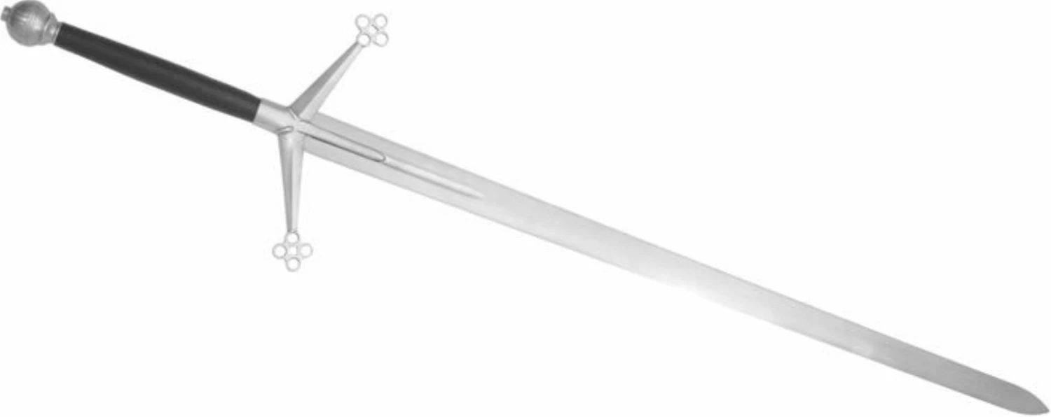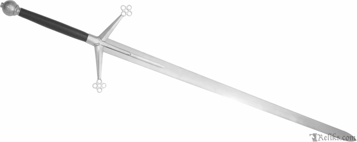 Mainstay of the Highland warriors of the late 15th and 16th centuries, the Claymore had a uniquely styled hilt that sets it apart from other great swords of the period. Typically of hand-and-a-half length, this versatile weapon could deliver great sweeping slashes or powerful thrusts. Replicated from a surviving museum piece our Highland Claymore is classic in its design, with distinctive sloping quillons terminating in quatrefoils and a high-collared quillon block with langets following the blade #fuller. The leather-covered grip is topped by a globate pommel.