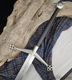 Mainstay of the Highland warriors of the late 15th and 16th centuries, the Claymore sword had a uniquely styled hilt that sets it apart from other great swords of the period. Typically of longsword length, this versatile weapon could deliver great sweeping slashes or powerful thrusts. Classic in its design, with distinctive sloping quillons terminating in quatrefoils and a high-collared quillon block with langets following the blade fuller. Kingston Arms proudly presents the Scottish Claymore in this refined version of this popular and distinguishable sword. Many reproductions of the Scottish Claymore tend to be bulky, clunky and out of balance compared to originals. The slim grip of the Claymore is leather-covered. The pommel of this Highland Scottish Claymore in more in proportion and design consistent with historical pieces.