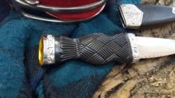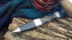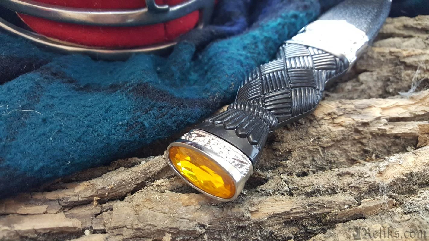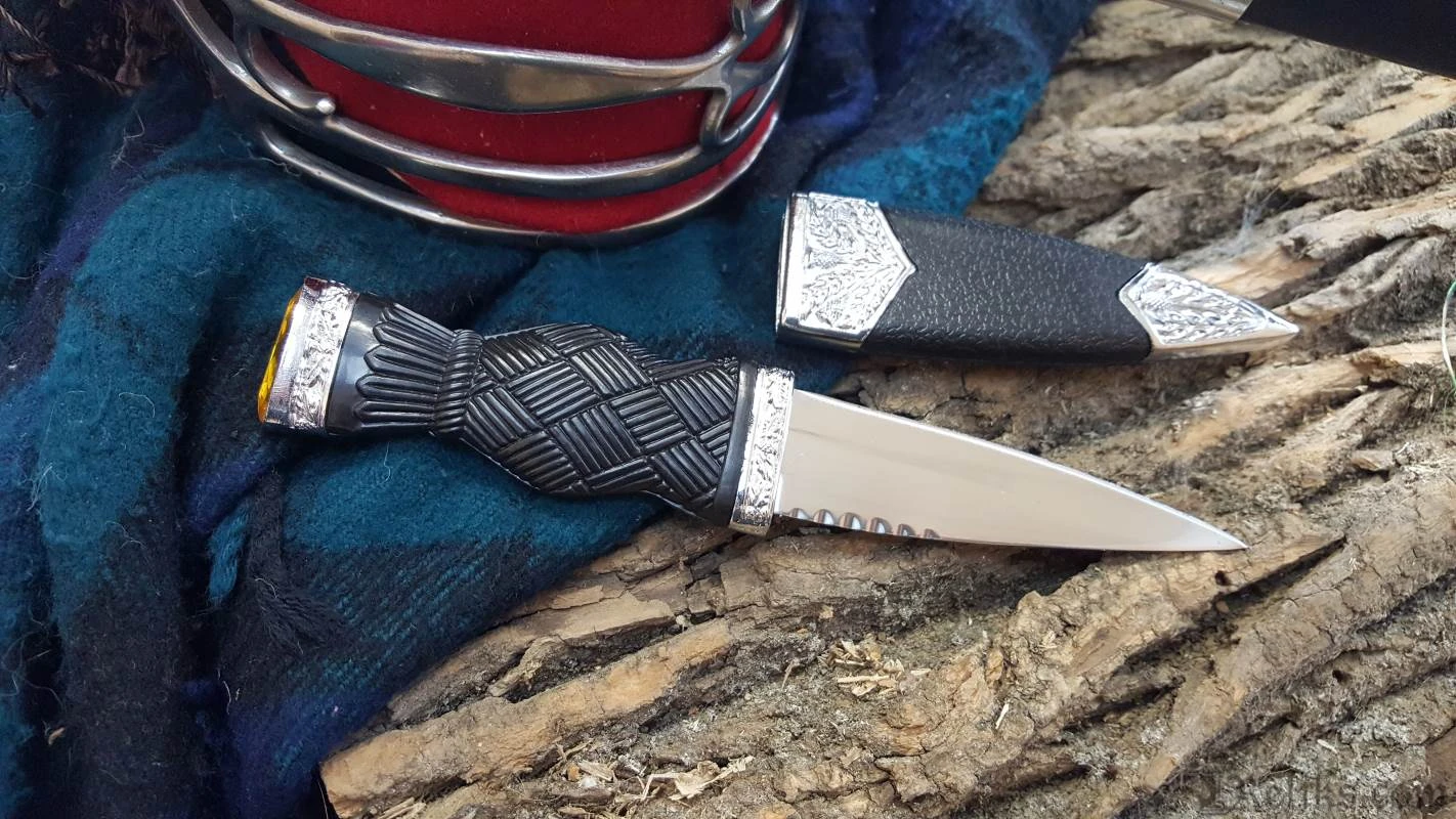 Complete your pipers outfit or Highland dress with this ornamental sgian dubh. Traditionally worn today in the top of the hose, the sgian dubh originated as a dagger concealed in the armpit for protection. The Scottish Sgian Dubh is adorned with a faux amber stone and silver toned metal fittings with a thistle theme. The blade is constructed of stainless steel.