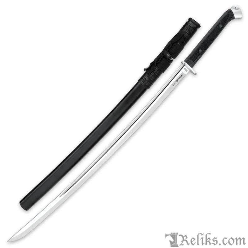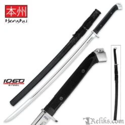 The Honshu Boshin Katana fuses tradition and innovation to yield a masterwork of modern sword design. True to the legendary katanas roots, the Boshin boasts a 30 3/8” 1060 high carbon steel blade thats unrivaled in sharpness and strength. But this is no ordinary Katana. Trading traditional trappings for chic contemporary style, the cutting edge Boshin is an undeniably modern weapon. Textured TPR shrouds the handle for an ergonomic no-slip grip you cant get from conventional ray skin and cord. The handle is crowned with an oversized polished steel pommel, and the guard snubs fanciful ornamentation in favor of a practical pointed ellipse design. In keeping with the Boshins clean, functional motif, the sleek wooden sheath is largely unembellished, save the genuine leather cord. Even among more expensive swords, the remarkably affordable Honshu Boshin Katana shines brighter than the rest. Wielding it is almost Zen-like you just have to experience it for yourself!