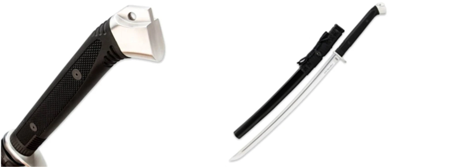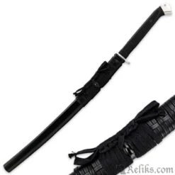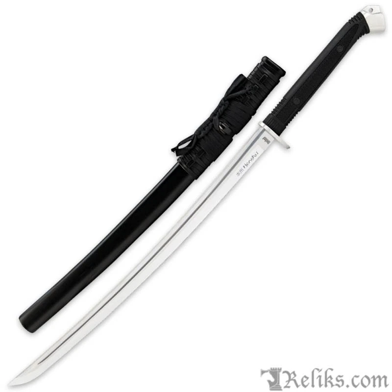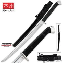 United’s new Honshu Boshin Wakizashi has a sleek, modern elegance to it. The incredibly sharp 22 1/2″ 1060 high carbon steel blade has a satin finish to complement the satin finished guard and pommel. The grip is of slip-free TPR to let you wield this sword with ease. A wooden scabbard with leather wrapping completes the package.